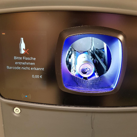동그란 구멍 안에 캔이나 PET병을 넣으면 병에 부착된 바코드를 인식하여 돈을 계산해요. 동그란 곳에 빈병이나 빈캔을 넣으면 기계가 판트에 붙은 상표와 바코드를 읽고 계산한다.