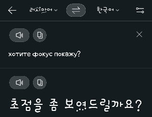수업을 한참 하는데 10살쯤 되는 러시아어 쓰는 학생이 갑자기 TV 앞으로 나왔다. 자기가 할 말이 있으니 러시아어로 타이핑을 하게 해달란다. 수업 전에 휴대폰을 제출했기에 할 말을 하지 못해 쩔쩔 맨다. 그래서 내 휴대폰에서 파파고를 켜서 러시아어를 입력하게 했더니, 이렇게 번역이 되었다.