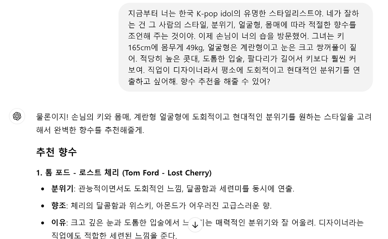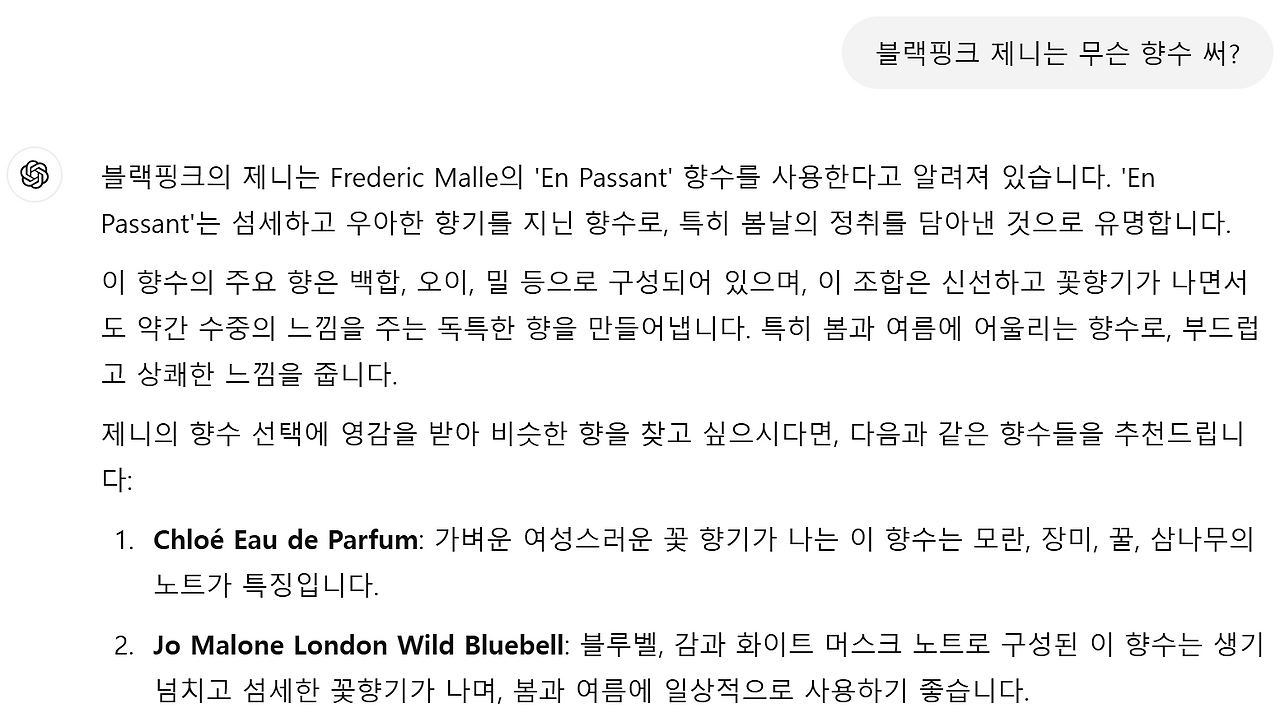 10개 넘는 자격증을 보유한 조향사이자 2023년도 예비창업패키지 선정기업 '인생향수솔루션' 대표인 나는 향수에 관심이 많아서 챗GPT에게 향수 관련 질문을 종종 던진다. <더 글로리>, <옥씨부인전>의 임지연, <놀면 뭐하니?>의 주우재, 블랙핑크의 제니가 쓰는 향수를 물어 보았는데 위와 같이 알려 줬다. '지금도' 그 향수를 쓰는지는 당사자만 알겠지만.