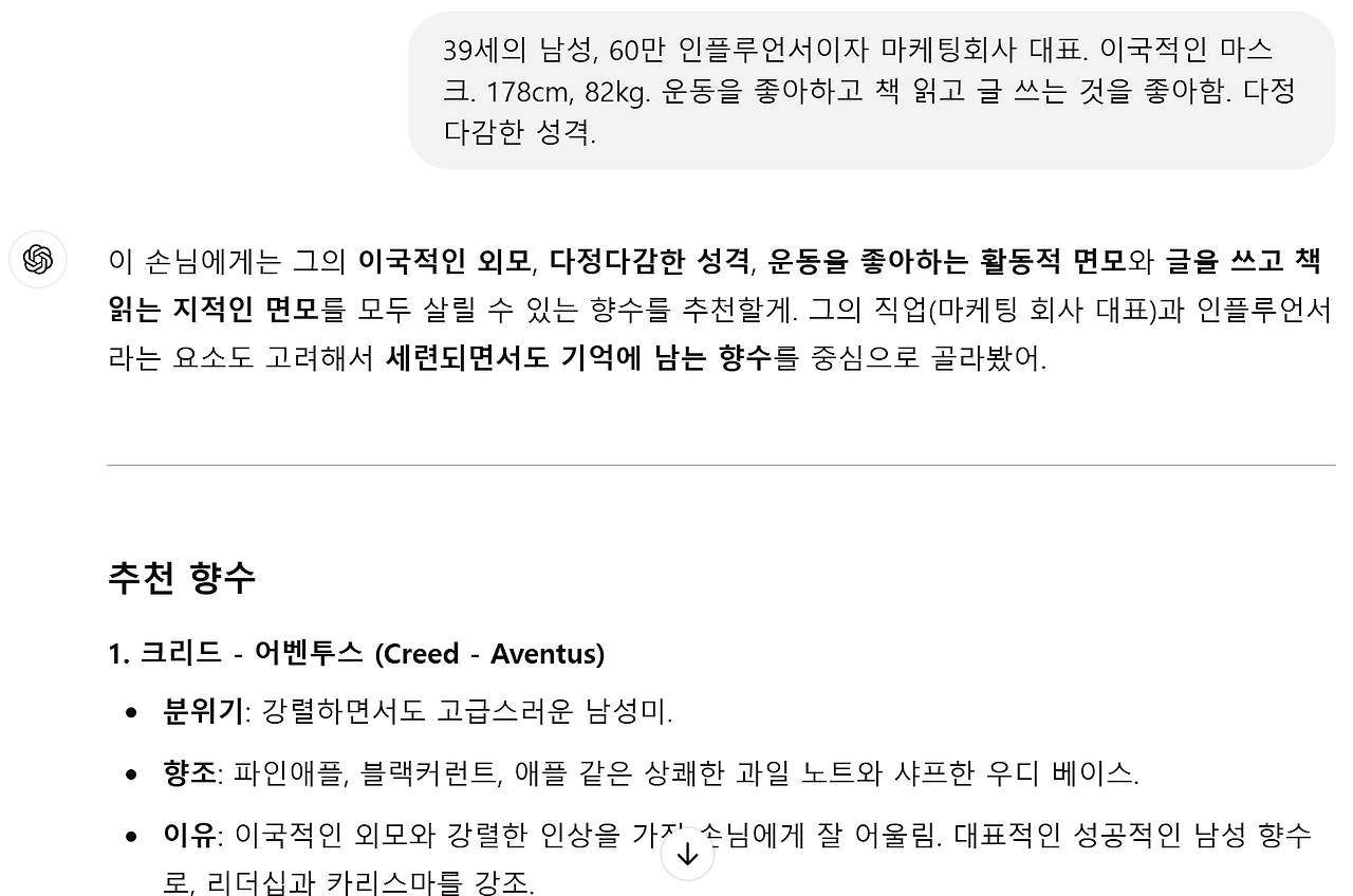 상대의 '추구미'에 맞는 향조를 가진 향수를 설득력 있는 이유를 들어 추천해 준다.