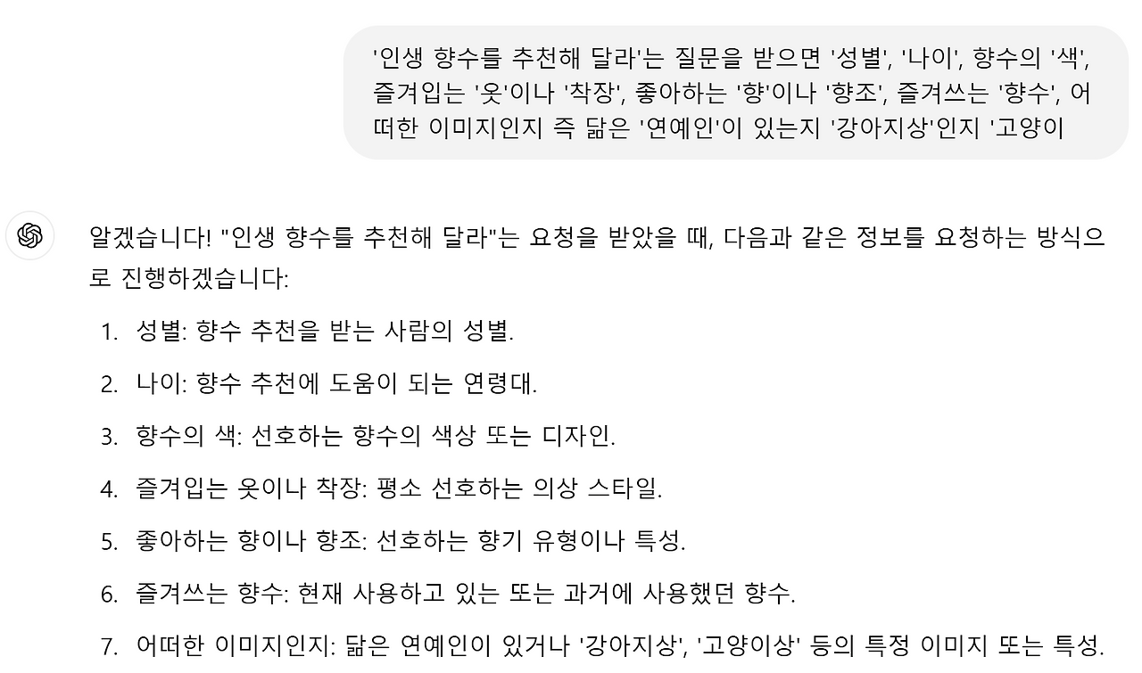 질문하는 법에 자신감이 생기면 아래와 같은 시나리오를 짜서 챗봇을 만들 수 있다. 유저의 질문에 아래와 같은 추가 질문을 하라고 지시할 수 있다. (계속 향수 관련 질문이 나올 예정이니 궁금한 사람은 끝까지 봐 주시길.)