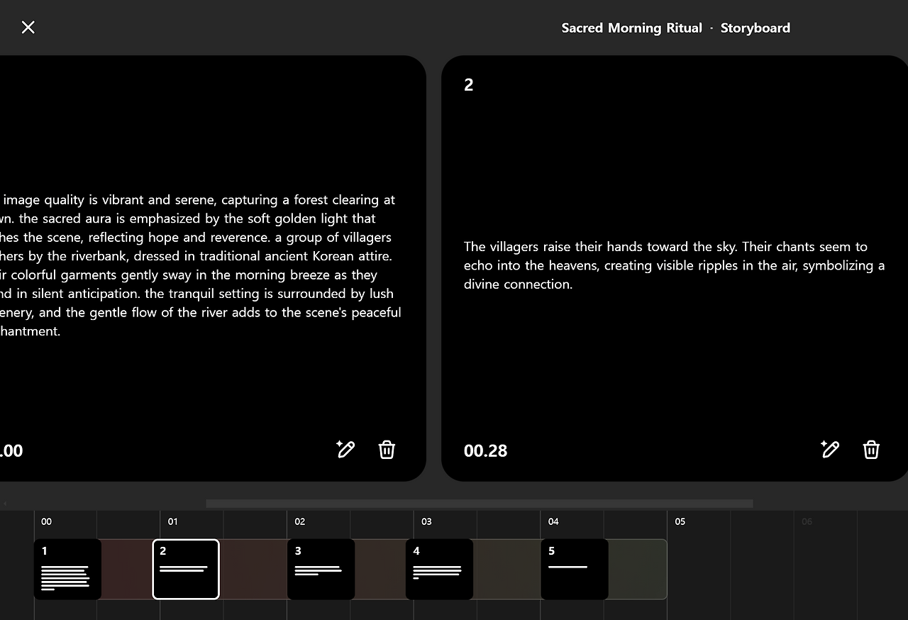 아직은 영어로 작성한 프롬프트가 더 구현이 잘되는 편이라 챗GPT의 도움을 받아 5컷의 스토리보드를 작성했다.