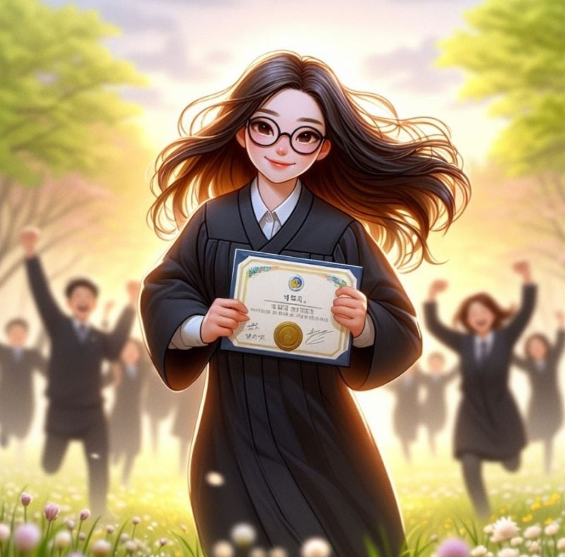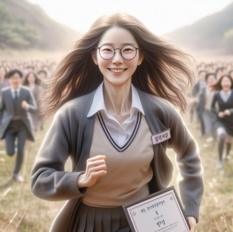 긴 머리와 검은 안경을 쓴 16년 차 국어 교사 김금진의 초상화. 그녀는 봄 햇살 아래 초원을 달리고, 미소를 지으며 자기개발 증명서를 들고 있다. 배경에는 그녀를 응원하는 500명 이상의 사람들이 있다.