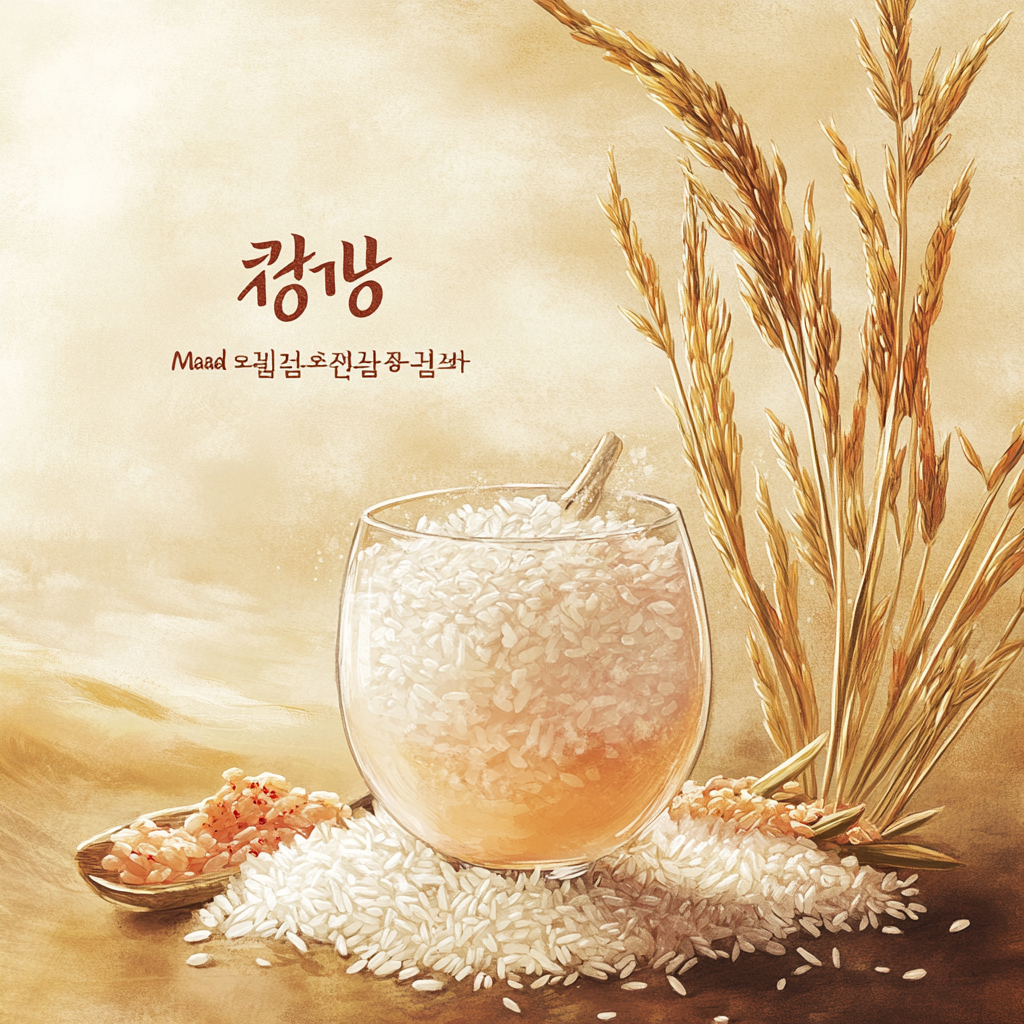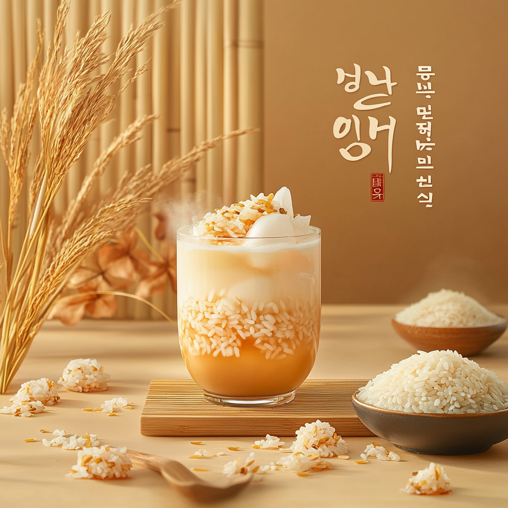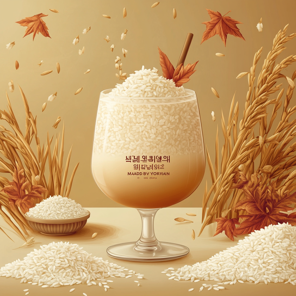 Vibrant and high-resolution banner showcasing a korean rice punch in a glass, surrounded by an array of rice, the background features warm shades of brown, reminiscent of a breezy autumn day, text on the banner highlights 'Made by korean'. The style of the text is traditional.