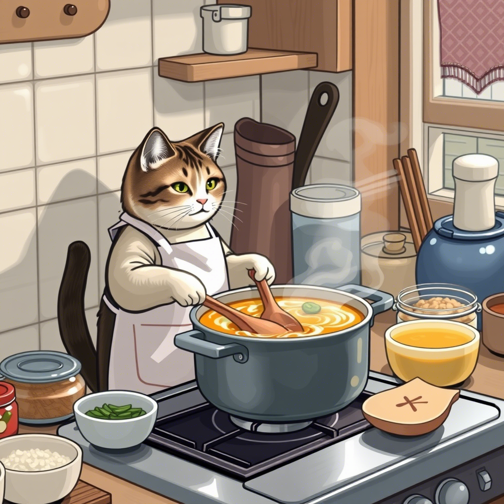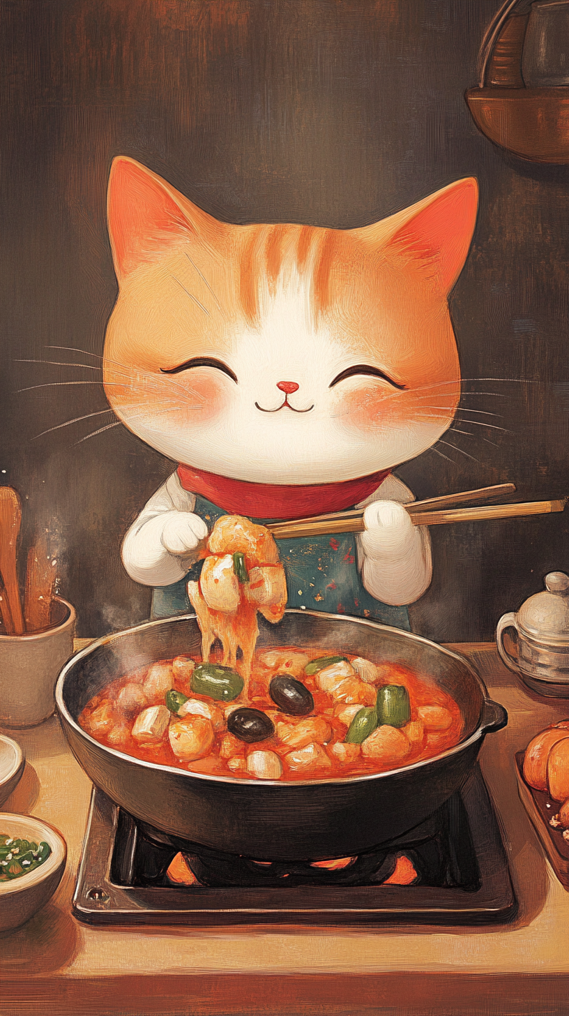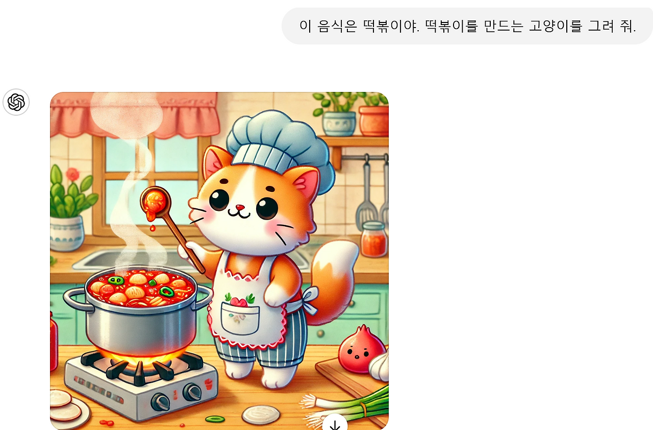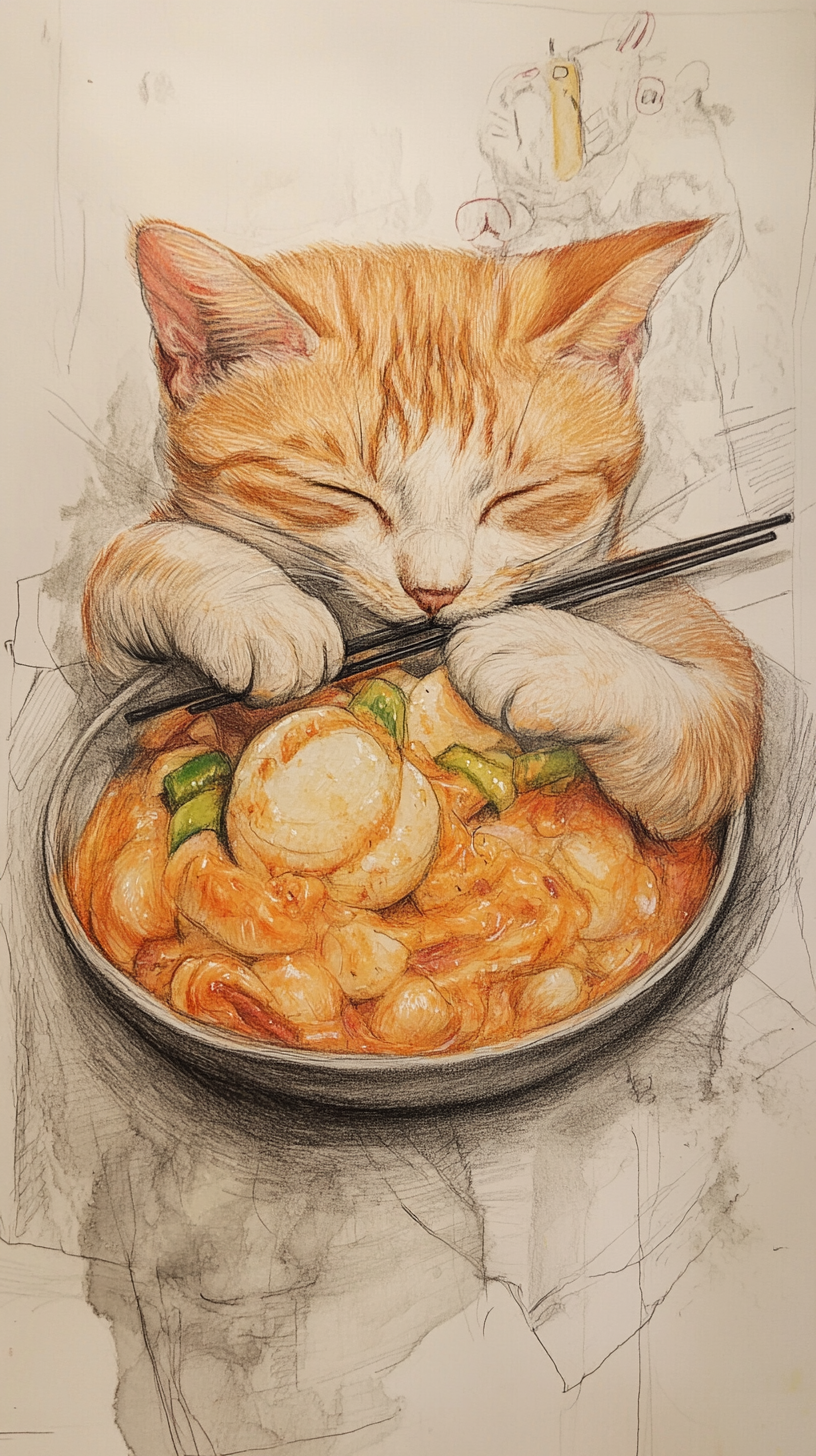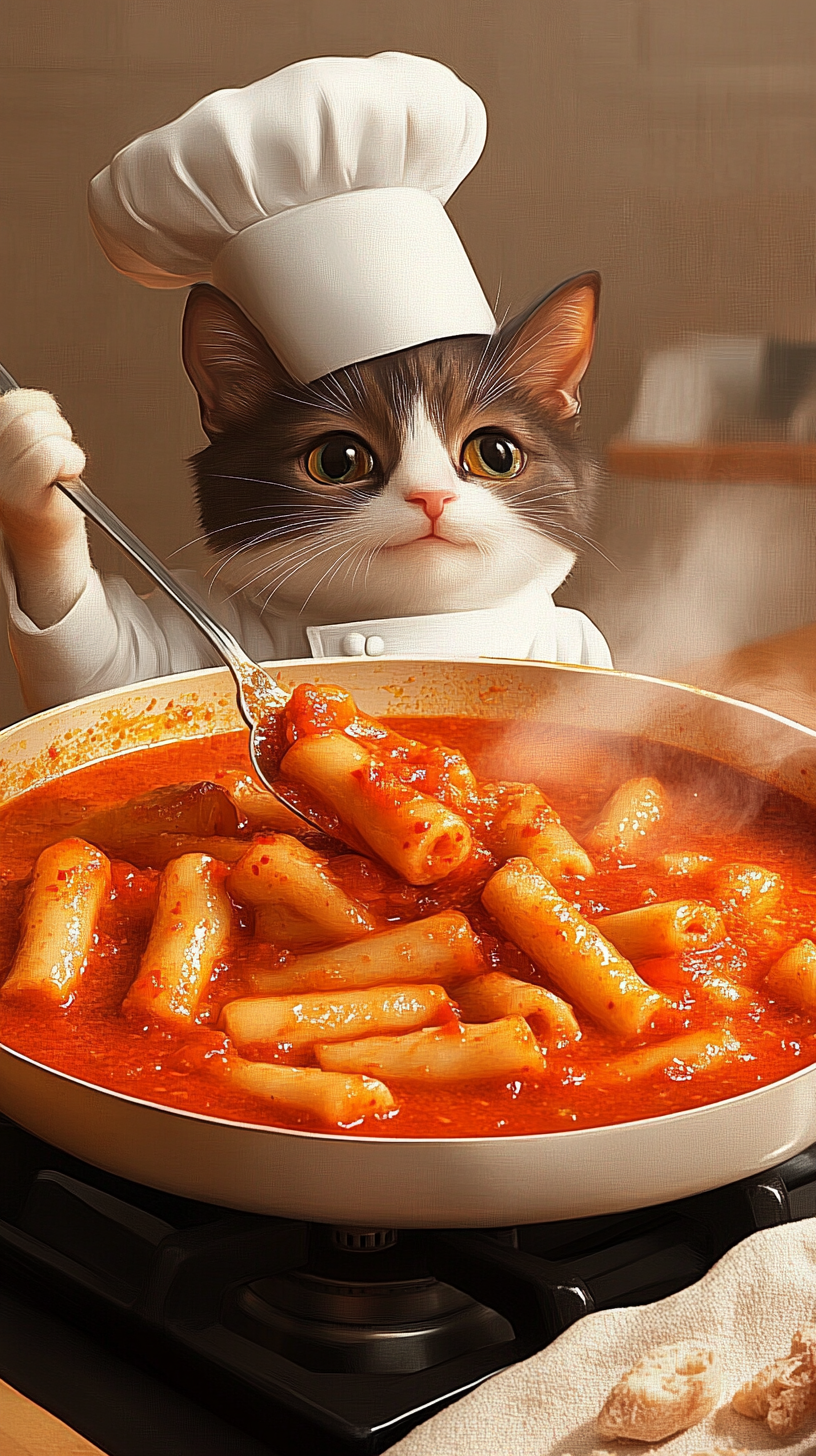 '떡볶이를 만드는 고양이를 그려 줘.'(Draw a cat making tteokbokki.)
