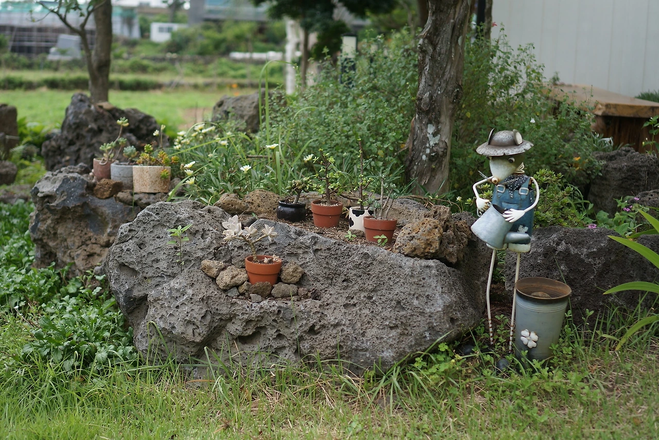 숙소에 체크인을 하고 숙소 인근 카페에서 아내와 메밀 커피를 마셨다. 관광객들로 북적이는 여느 제주 카페들과는 달리 손님이 많지 않아 고요한 점이 참 좋았다. 5월과 10월에는 카페 창밖으로 하얀 메밀꽃의 파도가 출렁인다는데, 비록 메밀꽃 구경은 못 했지만 이번 여행 동안 큰 목적 없이 지금 이 순간의 감정과 오감으로 느낄 수 있는 것들에 집중하자던 아내와 나의 여행 목적에 딱 들어맞는 곳이었다. 출입문을 열자마자 콧속으로 밀려들던 그윽한 편백나무 향도 좋았고 달짝지근하고 구수한 커피 맛도 좋았다. 들판에서 한가로이 뛰노는 강아지, 카페 곳곳 아기자기하게 꾸며진 조형물과 소품들을 보고 있노라니 '해솔이와 함께 찾았으면 참 좋아했을 텐데...' 하는 아쉬운 생각도 들었다.