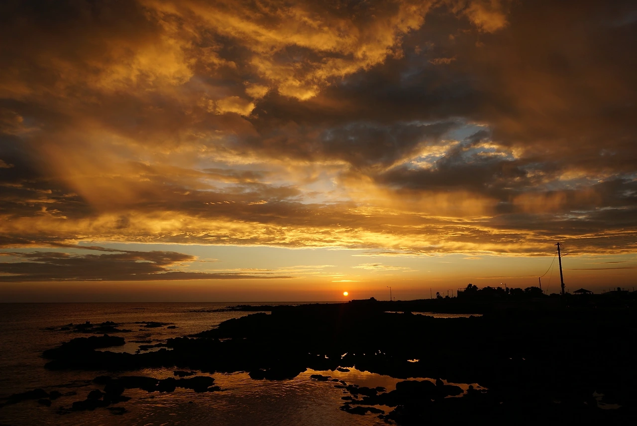 송악산 둘레길을 지나 모슬포 숙소에 도착하여 짐을 풀고 모슬포항에서 보말칼국수로 든든한 저녁을 먹고 나왔더니 붉은빛 하늘이 심상치 않았다. 항구 주변의 건물들에 가려져 온전란 일몰을 보기엔 글렀다는 생각이 들던 찰나 아내가 일몰을 보지 못하는 한이 있더라도 한 번 시도는 해 보자는 말을 건넸다. 제주에서의 마지막 저녁, 바닷속으로 가라앉는 해를 놓칠세라 항구에서 일몰을 볼 수 있을만한 곳으로 무작정 달렸다. 전망을 가리는 장애물 없이 탁 트인 바다가 보일 만한 곳에 다다르니 다행히도 해는 아직 바닷속으로 가라앉지 않고 우리를 기다렸고, 우리는 수평선 아래로 가라앉는 해의 모습과 함께 평생 잊지 못할 아름다운 노을의 장관을 눈에, 그리고 카메라에 담을 수 있었다.