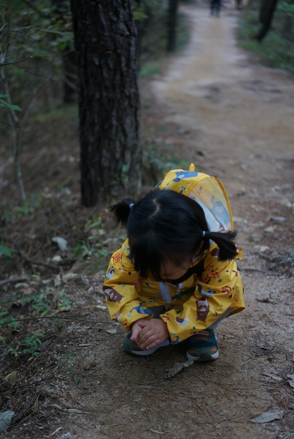 갖가지 동물들이 그려져 있는 노란 우의를 입은 딸내미는 씩씩하게 산길을 오르며 미션을 위해 나뭇잎, 도토리, 솔방울들을 줍고 평소 어린이집에서 아빠에게 풀어놓지 못했던 이야기보따리를 이번 기회에 다 풀어놓으려는 듯 끊임없이 재잘거렸다. 아이와 단둘이 국사봉에 오를 때는 이것저것 신경 쓰느라 많은 이야기를 나누지 못하고, 정상까지 빨리 올라가기 위해 아이를 재촉하기 바빴지만, 오늘은 함께 오르는 가족들도 많고, 중간중간 미션을 해결해야 했기에 아이와 오랫동안 이야기를 나눌 수 있어 참 좋았다. 한 걸음 한 걸음 천천히 옮기며 눈에 담는 가을 정취도 일품이었다. 몇 주 전 아이와 함께 국사봉에 올랐을 때만 해도 아직 가을이라는 실감이 나지 않았는데 이제 제법 떨어진 갖가지 낙엽들과 붉고 노란 옷으로 갈아입은 나무들의 모습을 보니 정말 가을이구나 하는 생각이 들었다.