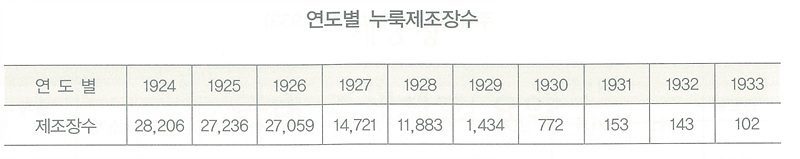 1924년대만 하더라도 전국에 28,206개의 누룩 제조장이 있었고 면허 인원은 37,759명, 그 공장들이 만들던 누룩 양은 45,103톤이었다.