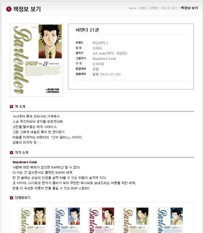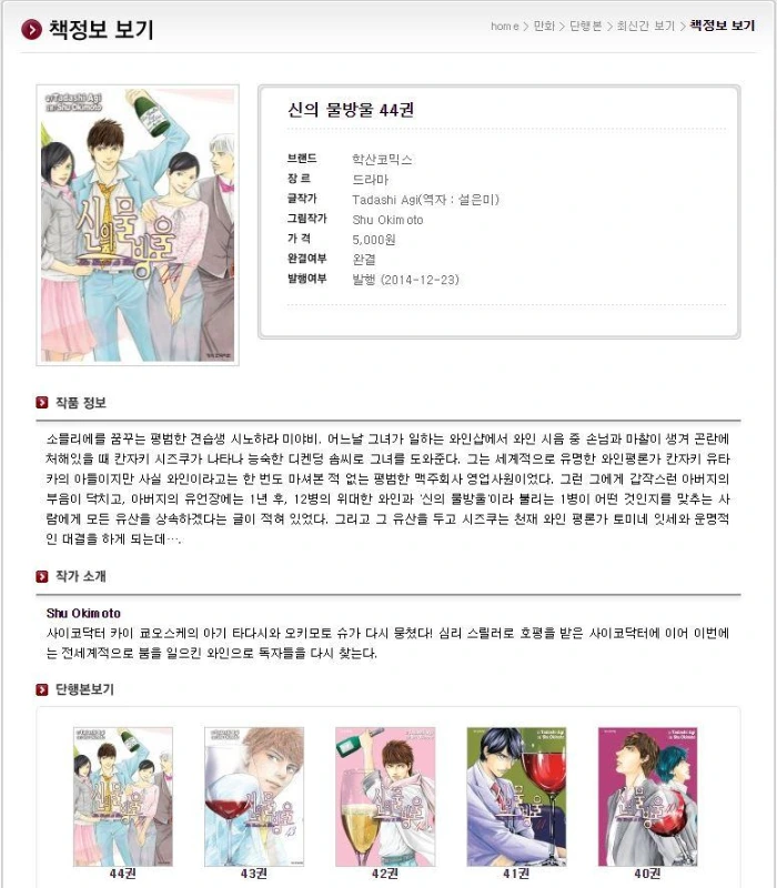 술 하면 떠오르는 만화책을 이야기하라면 많은 사람들이 ‘신의 물방울’을 이야기할 것이다. 와인을 공부하는 분들이라면 한 번씩은 본 책일 것이다. 그 외에도 칵테일 등 바에서 파는 술들과 관련된 ‘바텐터’, 일본 사케를 만드는 것에 대해서 잘 설명한 ‘나츠코의 술’ 등 대부분의 책이 일본에서 발간된 것들이다. 한국에서 발간된 책은 ‘술술술’, ‘대작’, ‘오늘 술맛은 안녕하세요?’ 정도가 아닐까 싶다. 막걸리 열풍이 불 때 전통, 제조법 등과 관련된 스토리 중심의 책들이었다. 최근에는 웹툰으로 ‘술꾼 도시 처녀들’, ‘대동여주도’ 등도 있지만 음식과의 매칭보다는 술과 관련된 이야기 중심이다.