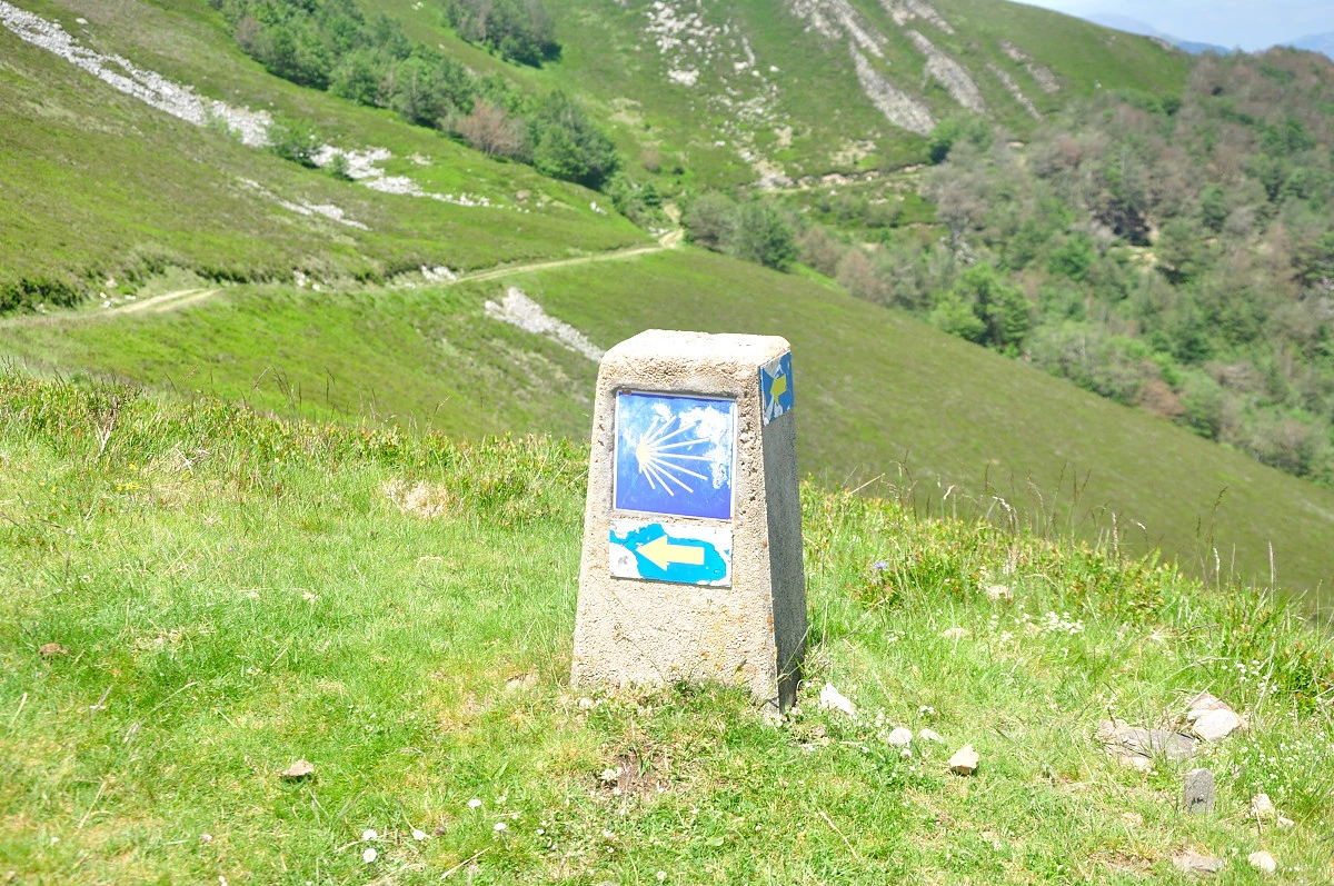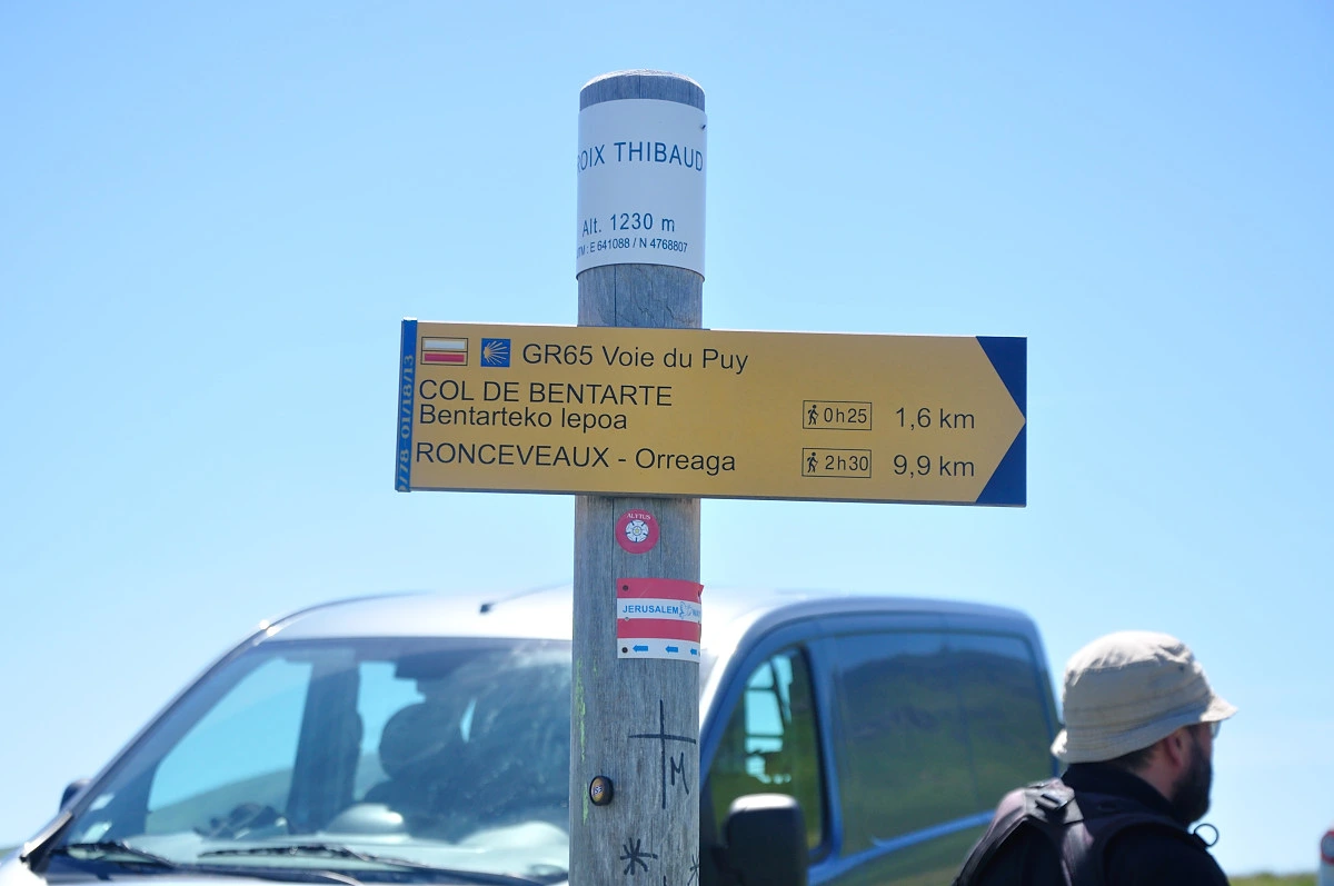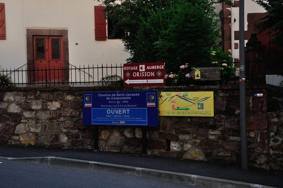 피레네를 향하는 길 곳곳에 순례길을 상징하는 표시물들이 곳곳에 보인다. 노란색화살표 뿐만 아니라 파란색바탕에 구불구불길이 그려진 표시물도 벽이나 전봇대에 부착되어 있다. 그렇지만 익숙하지 않은것은 지명이 아직은 프랑스어라는 것이다. Roncesvalles라는 지명도 Ronceveaux로 표시되어 있어 자칫 익숙하지 않은 지명으로 헷갈릴수도 있을 것이다.
