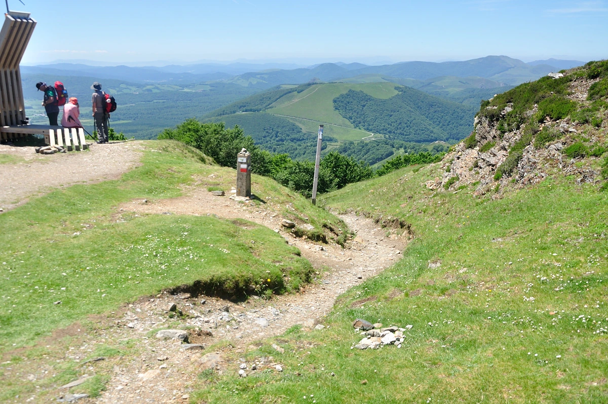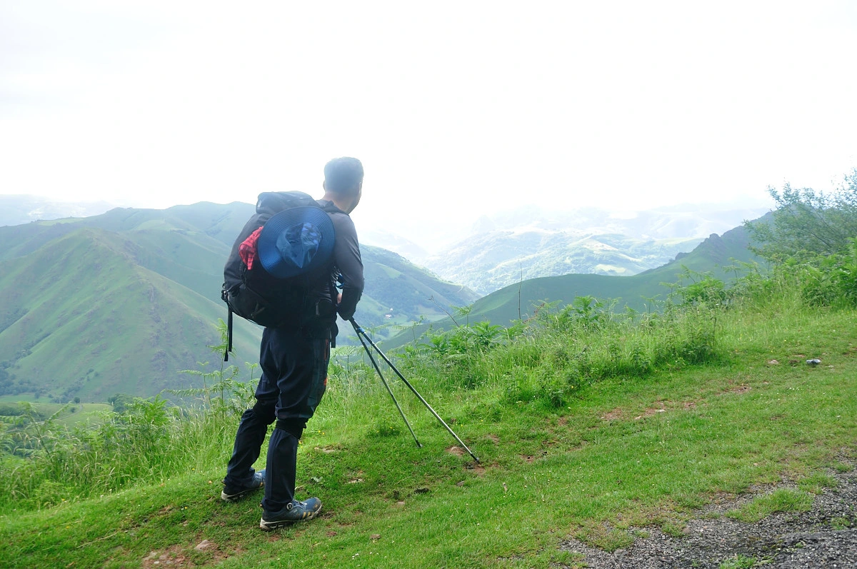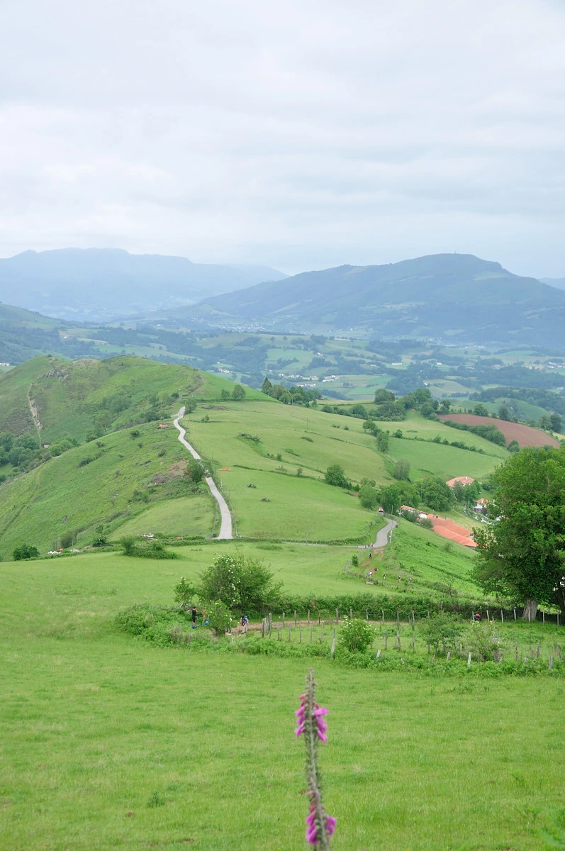 곳곳에 목장의 풍경과 산자락이 중첩되는 풍경을 접할 수 있었지만 가픈 숨을 내쉬며 올라가다보니 또렷하게 보이지 않는다. 좀더 올라가 바위옆에서 배낭을 푸르고 5분여 쉬고나니 주변 피레네산맥 풍경이 눈에 들어오기 시작했다. 6월이라 눈은 내리지 않았고 푸른 풀들이 자라나 녹음이 가득한 색깔로 겹겹히 쌓여 보였다. 고개를 돌려 위를 보아도 푸른색 잔디밭이 깔린것처럼 큰나무가 없는 민둥산처럼 보였다.