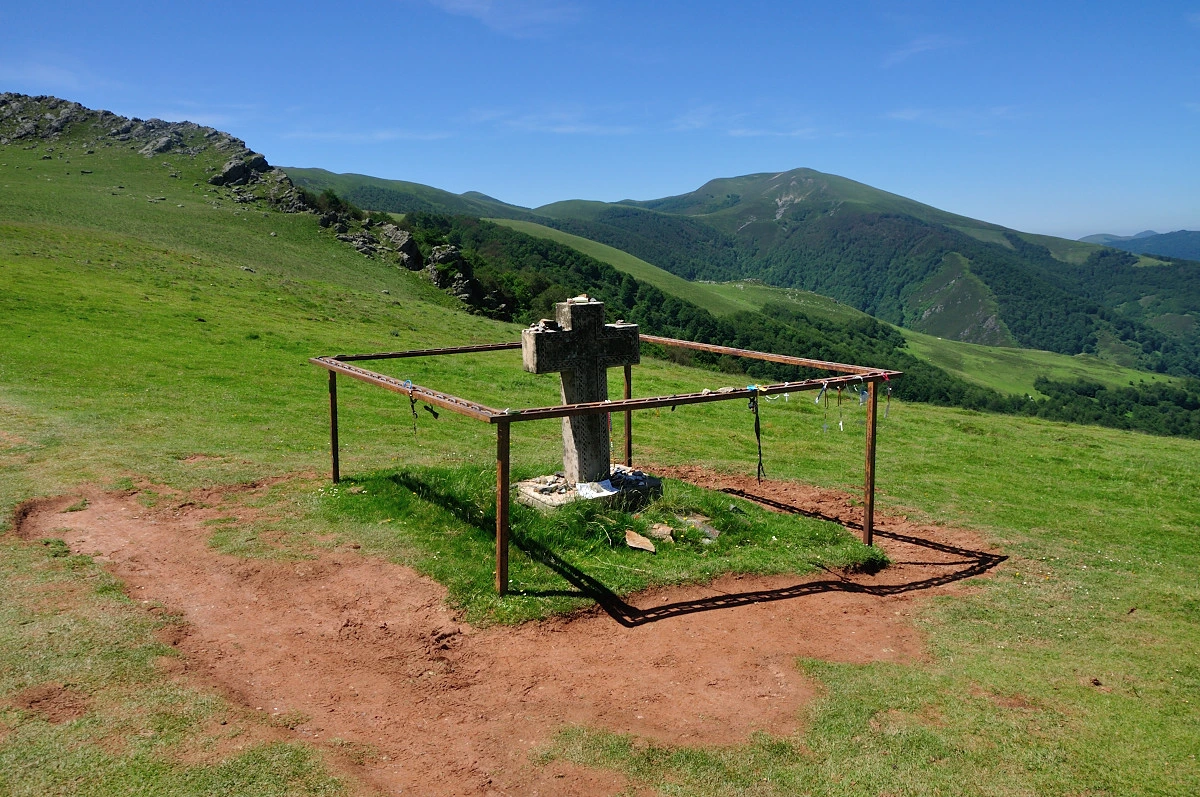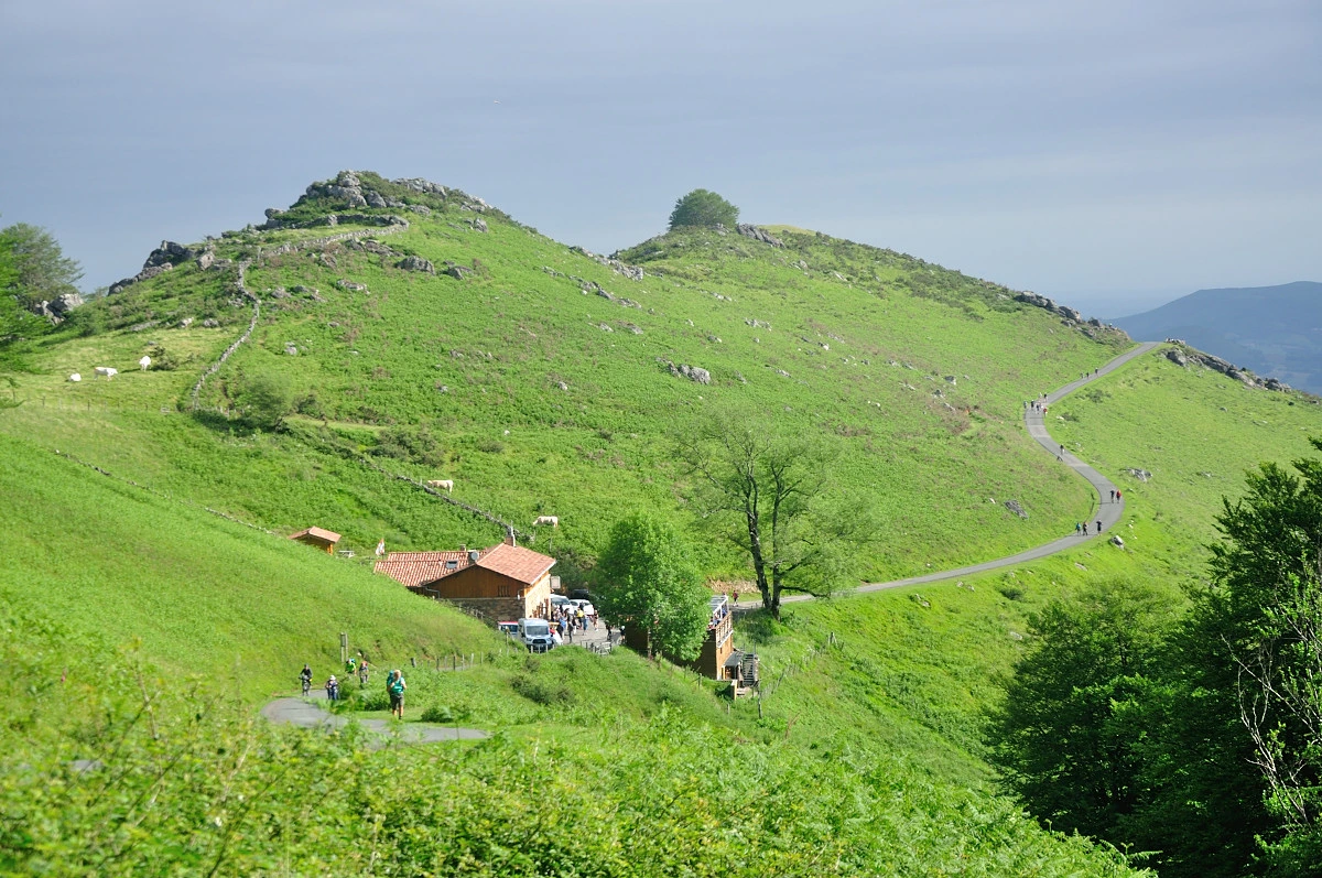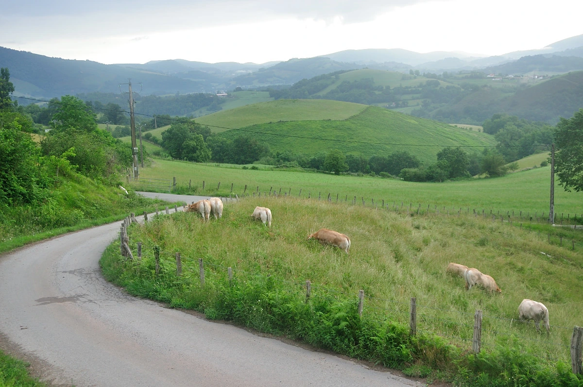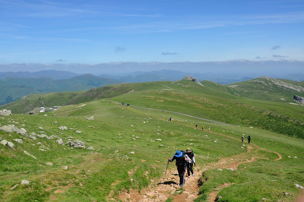 곳곳에 목장의 풍경과 산자락이 중첩되는 풍경을 접할 수 있었지만 가픈 숨을 내쉬며 올라가다보니 또렷하게 보이지 않는다. 좀더 올라가 바위옆에서 배낭을 푸르고 5분여 쉬고나니 주변 피레네산맥 풍경이 눈에 들어오기 시작했다. 6월이라 눈은 내리지 않았고 푸른 풀들이 자라나 녹음이 가득한 색깔로 겹겹히 쌓여 보였다. 고개를 돌려 위를 보아도 푸른색 잔디밭이 깔린것처럼 큰나무가 없는 민둥산처럼 보였다.