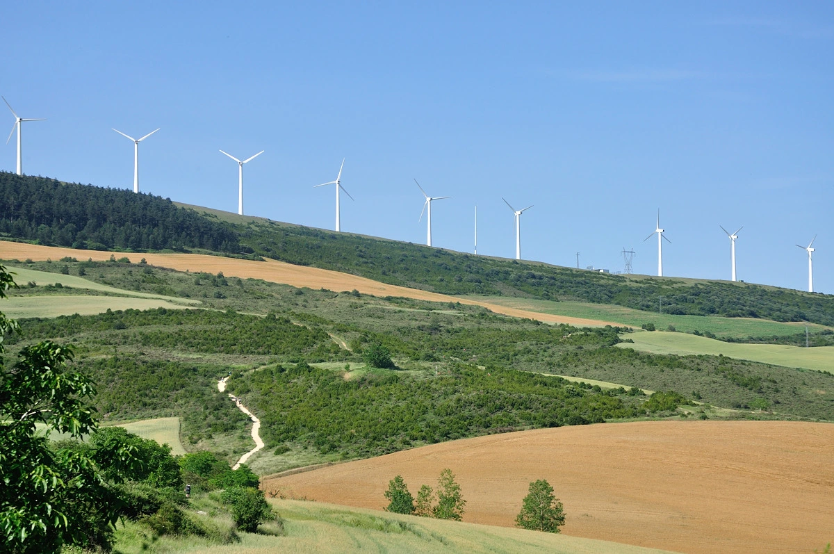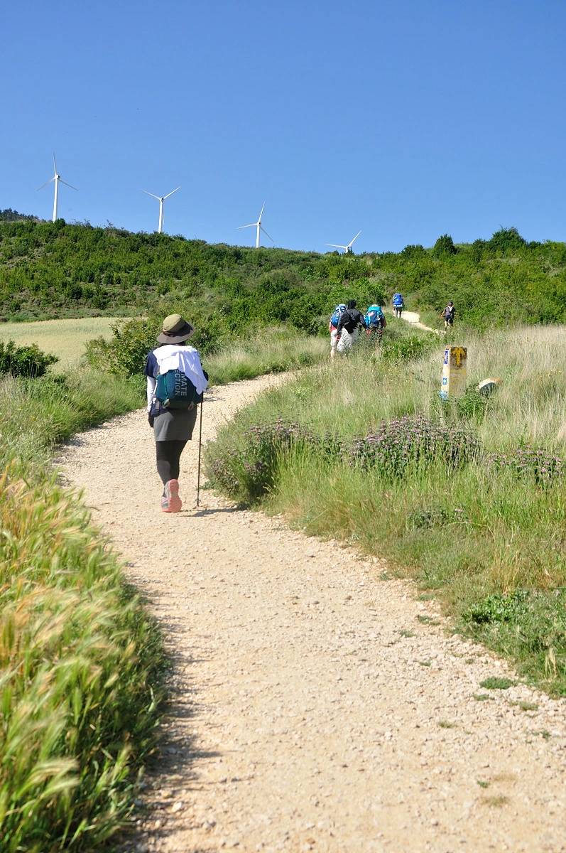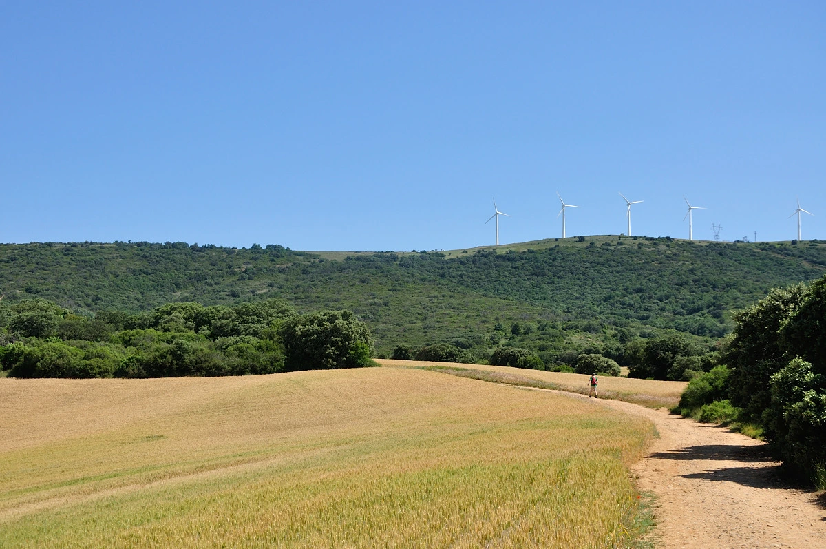 마을 외곽에 다다랐을때 정면에 가로질러 나타난 산줄기가 보였다. 오늘 '용서의언덕(Alto de Perdon.)'을 지나간다고 했는데 그 언덕이 있는 곳으로 짐작이 되었다. 멀리서 보아도 높아 보이는 산줄기와 그 위에 줄지어 서있는 풍력발전기의 모습...