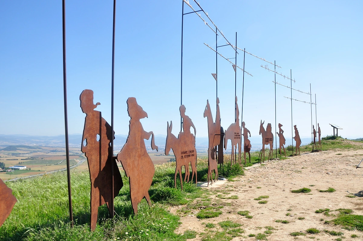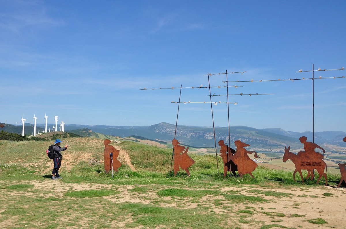일행들이 다 올라온 것을 확인하고서야 기념비 앞에 배낭을 풀고 찬찬히 주변을 둘러보았다. 사진도 찍고, 조형물 앞에 다가가 어루만져 보기도했다. 그늘이 없는 언덕꼭대기 이지만 시원한 바람때문에 견딜 수 있어 땀을 식히며 주변을 내려다 보았다. 왼쪽으로 가면 앞으로 가야할 푸엔테라 레이나로 가는 길이고, 오른쪽은 우리가 지나온 팜플로나가 보였다. 그리고 정면에는 말을 타고 걸어가는 순례자 조형물이 보인다.