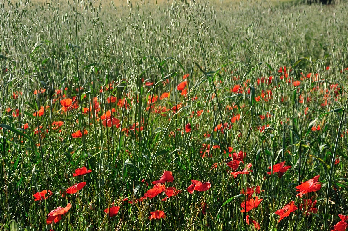 우리 일행은 쉬어가기 전까지는 같이 무리지어 걷는 경우가 없다. 걷더라도 시간이 지나면 다시 자신의 습관대로 걸어서 사이가 벌어지기 일쑤이다. 그래도 왜 빨리 걷는지 물어보아도 같이가자는 말은 하지 않는다. 나름에 배려라고 해야 할까? 낮은 산이 연이은 동산은 밀인지 보리인지 알 수 없는 밭으로 빼곡했다. 누렇게 익어가는걸 보면 보리같기도 한데... 이보다 중요한것은 푸른 하늘과 곡식이 물들어간 누런 벌판의 풍경이 아주 멋드러진다는 것이다. 그리고 길변에 피어있는 양귀비꽃이 밋밋한 풍경에 변화와 재미를 주고 있다.