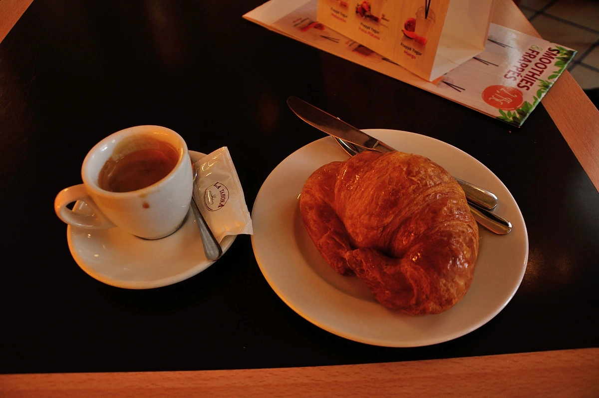 알베르게에서 나오면서 별도로 아침식사를 준비하지 못한것도 있지만, 밖에 걸으면서 맛있어 보이는 Bar에서 아침식사를 하자는 의견이 많아 그렇게 하기로 했다. 팜플로나를 벗어나기 전에 고소한 냄새가 풍기는 빵집을 발견하고 그곳으로 발걸음을 옮겼다. 그리고 Cafe con leche 또는 Cafe Solo 한 잔과 크라상 또는 토스트로 입맛에 따라 주문하기 시작했다. 여기서 맛보는 크라상은 달지도 않고 담백하고 크기가 커서 한국에서 맛보는 크라상과 비교할 수 없다.