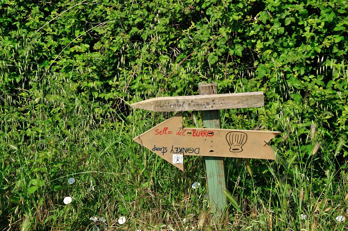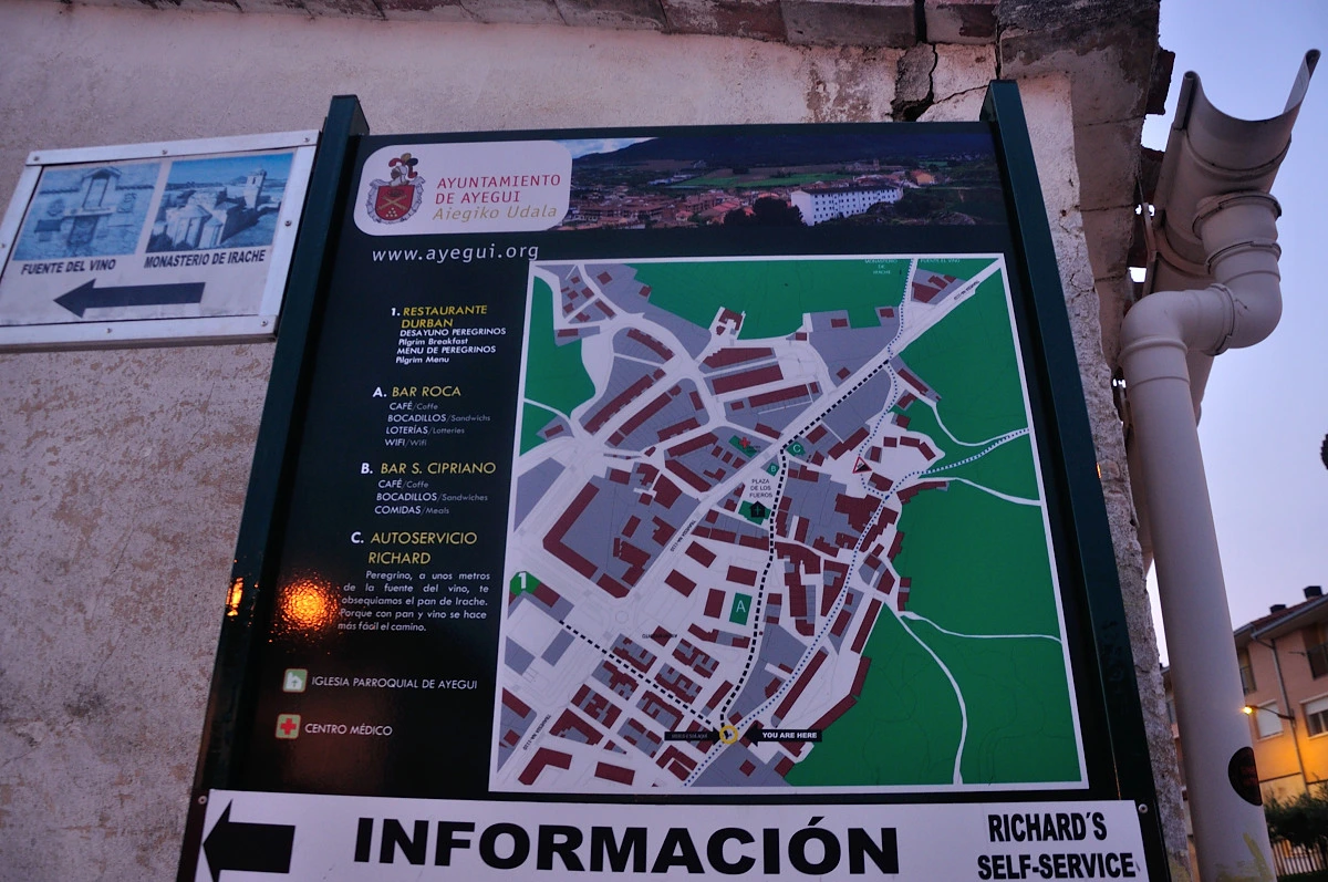 Estella 끝자락에 Ayegui 마을로 접어 들었다. 여기에는 순례길 표시물이 잘 보이지 않는다. 그러다보니 알베르게표시와 같이 있는 노란색 화살표를 따라가는 경우도 있고 그대로 직진해서 걷는 순례자도 있다. 고민끝에 주변을 둘러보니 마을 안내표시가 붙어 있어 확인해보니 어느길로 가도 상관없는 갈림길이다. 이곳 알베르게에서는 100km 인증서를 수여한다고 한다. 실제 지금까지 걸어온 거리는 120여 키로가 넘지만 론세스바예스를 기점으로하면 Ayegui가 100km되는 지점이라고 한다. 그래서 첫 100km 완주 인증서를 이곳에서 주어지는데 너무 이른시간에 나서다 보니 받을 수 있는 여건이 되지 않았다. 새벽에 나오면 좋은점이 시원하게 걸을 수 있는것이라면, 단점은 그외 경험에 있어 제한을 받는것이 많다라는 점이다.