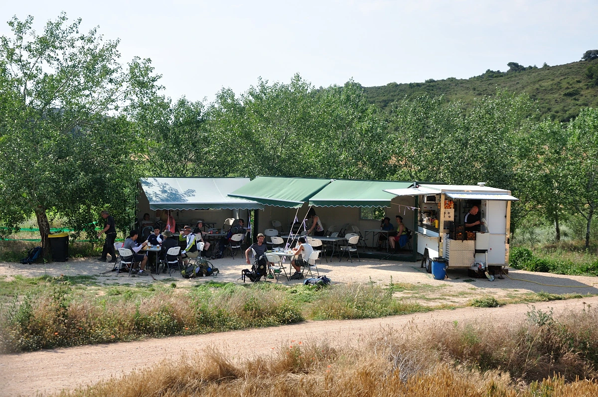 땡볕을 피할 수 있는 것은 나무그늘뿐이며, 이러한 길을 한 두 시간 걷다보면 지치게 마련이다. 그런데 마을이 없다는것은 쉬어갈만한 장소나 Bar같은 것이 없음을 나타내는데 어찌되었던 견디며 걸어야 했다. 가끔은 다행스럽게도 들판 한가운데 푸드트럭같은것이 존재할때도 있다. 그러면 순례자들은 약속이나 한것처럼 하나둘씩 그곳을 들렸고, 앞서간 순례자들은 뒷 사람들을 위해 자리를털고 의자를 비워준다.