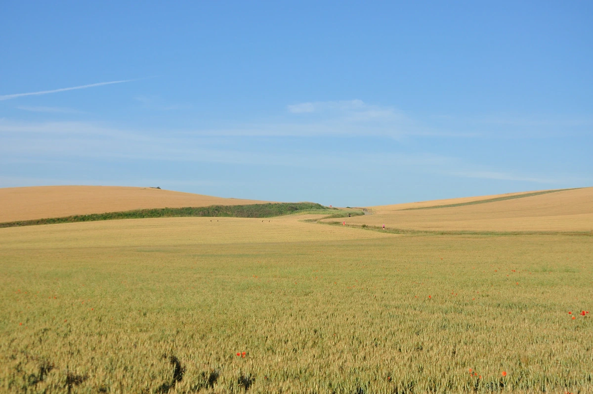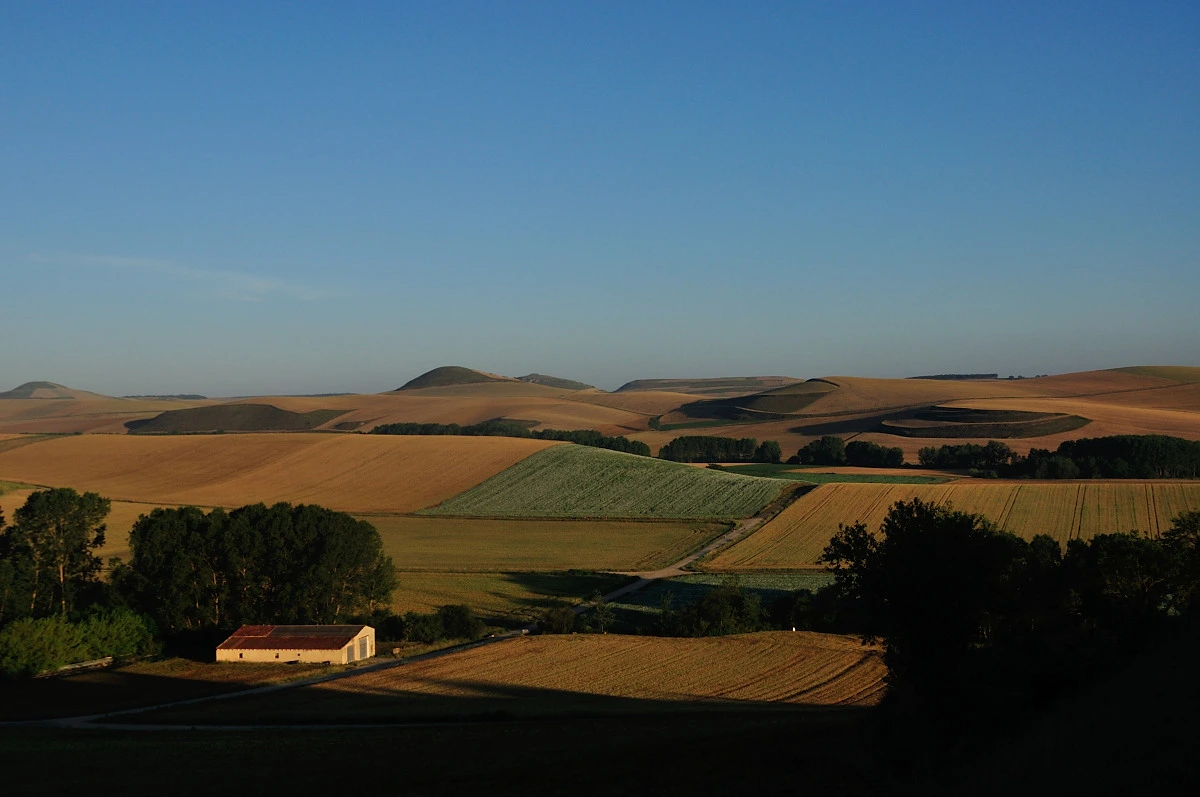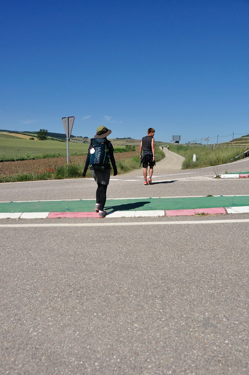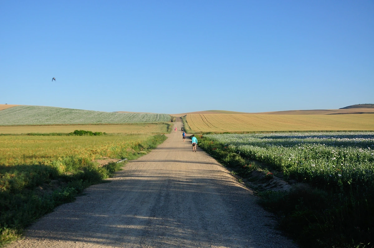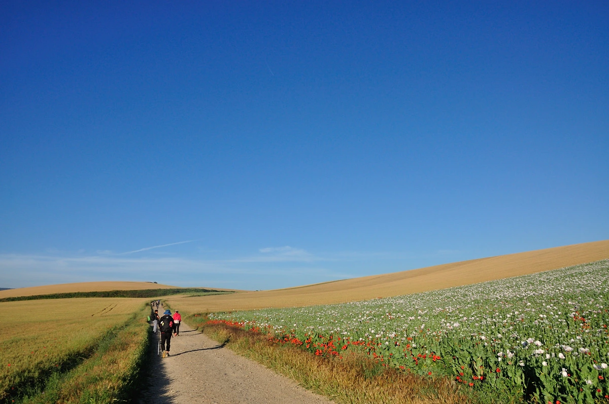 Belorado가는 길은 완만한 오르막이다. 내가 오르막길을 가고 있다는 것조차 느낄 수 없을 만큼 완만하고 평이한 길이다. 아직 메세타 평원에 들어서지는 않았지만 평원처럼 넓은 구릉이 계속되는 길이다. 그곳에 무엇이 자라고 있는지가 땅의 색깔을 결정한다. 밀밭이 남은 곳에는 옅은 갈색빛이며, 양귀비가 자라는 곳에는 하얀점과 붉은점이 가득한 붉은빛이 감돈다. 그리고 어느곳은 푸른빛이 감돈다. 멀리서 보면 작은 천을 짜깁기한 식탁보를 펼쳐 놓은 듯 하다.
