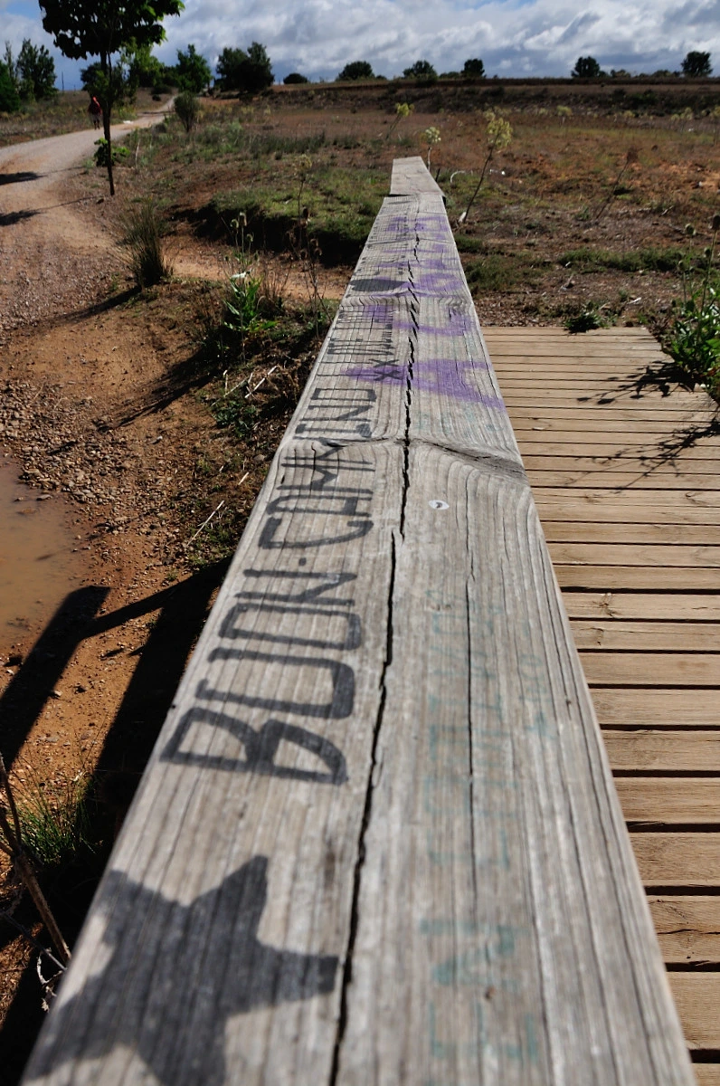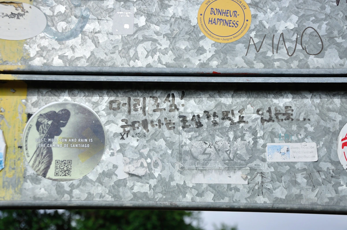 La Virgen del Camino 마을을 벗어나면서 갈림길이 있음을 알려주는 표시판이 곳곳에 보이기 시작했다. 첫번째로 보이는 안내표시판에 순례자들이 모여 웅성거리며 서로 얘기를 나누고 있다. 어디로 가야할지 고민하거나 갈림길의 위치가 어디인지 명확하게 알기위해 안내판을 집중하여 들여댜 보고 있다. 나또한 안내판을 해석하기 위해 찬찬히 들여다 보았다. 코스 지도 아래 누군가가 그려놓은 지도와 문구가 보였다. 'Aqui(Here)'라r고 표시된 곳이 현재 표시판의 위치이고 갈림길까지는 약 1km 정도 더 걸어가야 했다. 해석이 끝나니 마음 편하게 일행을 이끌고 길을 나섰다. 일부 순례자들은 우리를 따라 걷기 시작했다.