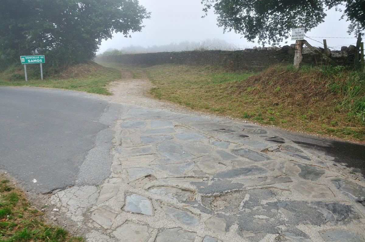 순례길은 한 코스가 하나의 길로 이어진줄 알았었다. 하지만 막상 다녀보니 우회길 또는 갈림길이 존재했다. 날씨 또는 안전을 위해 만들어 놓은 길도 있지만, 길의 의미를 부여해주고 부각해주는 지역을 찾아가기 위해 여분의 길을 만들어 놓기도 한다. Triacastela에서 Sarria 2개의 코스가 존재한다. Por Sanxil 과 Por Samos 로 마을을 벗어나기 직전에 양방향으로 노란색화살표가 설치된 곳을 마주한다. 나와 일행을 고민할 것도 없이 Por Sanxil 루트로 가기로 했다. 예전에도 일행한테 얘기했듯이 좀더 짧은 코스로 가기위해 선택하였다고 설명해주었다. 하지만 순례길의 역사와 문화를 좀더 알고자 하는 사람들이라면 Samos에 있는 수도원을 경유하는 코스로 가야한다. 전자의 코스보다 약 7km 정도 긴 25km의 거리를 평지구간으로 걸어야 한다.