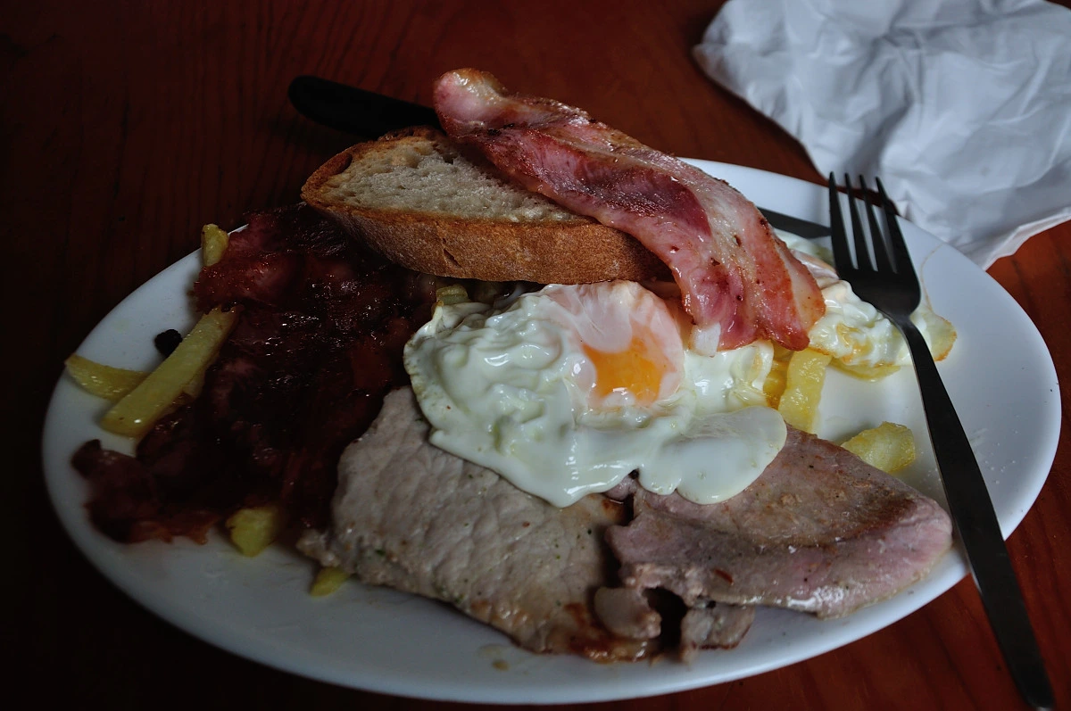 Gonzar부터 Bar에 불이켜져 쉬거나 아침식사를 할 수 있다. Bar에서 식사하는것이 일상화되다보니 나도 비상용이나 아침식사를 챙기는 것을 잊어 먹는다. 추운날에는 차가운 보카디요보다는 따스한 음식이 더욱 간절했다. 계란후라이와 베이컨과 감자칩이 콤비네이션을 이루는 이 음식... 미국스타일에 breakfast다. 4.5유로 이지만 어제 저녁을 술로 건너뛴 나한테는 해장국과 같았다. 예전 같으면 기름진 음식을 가렸을텐데 여기서는 그렇지 않다. 아무리 먹어도 빠지는 곳이 순례길이다.