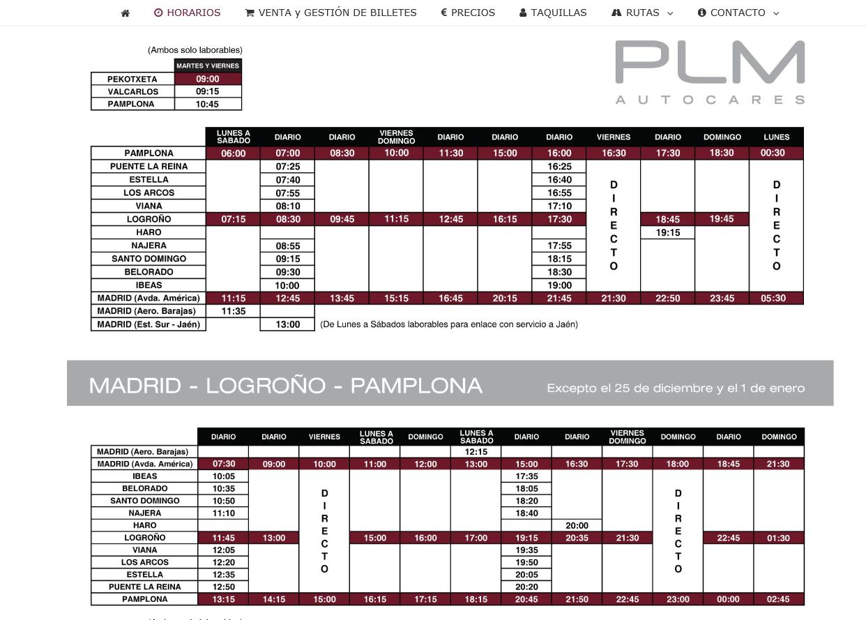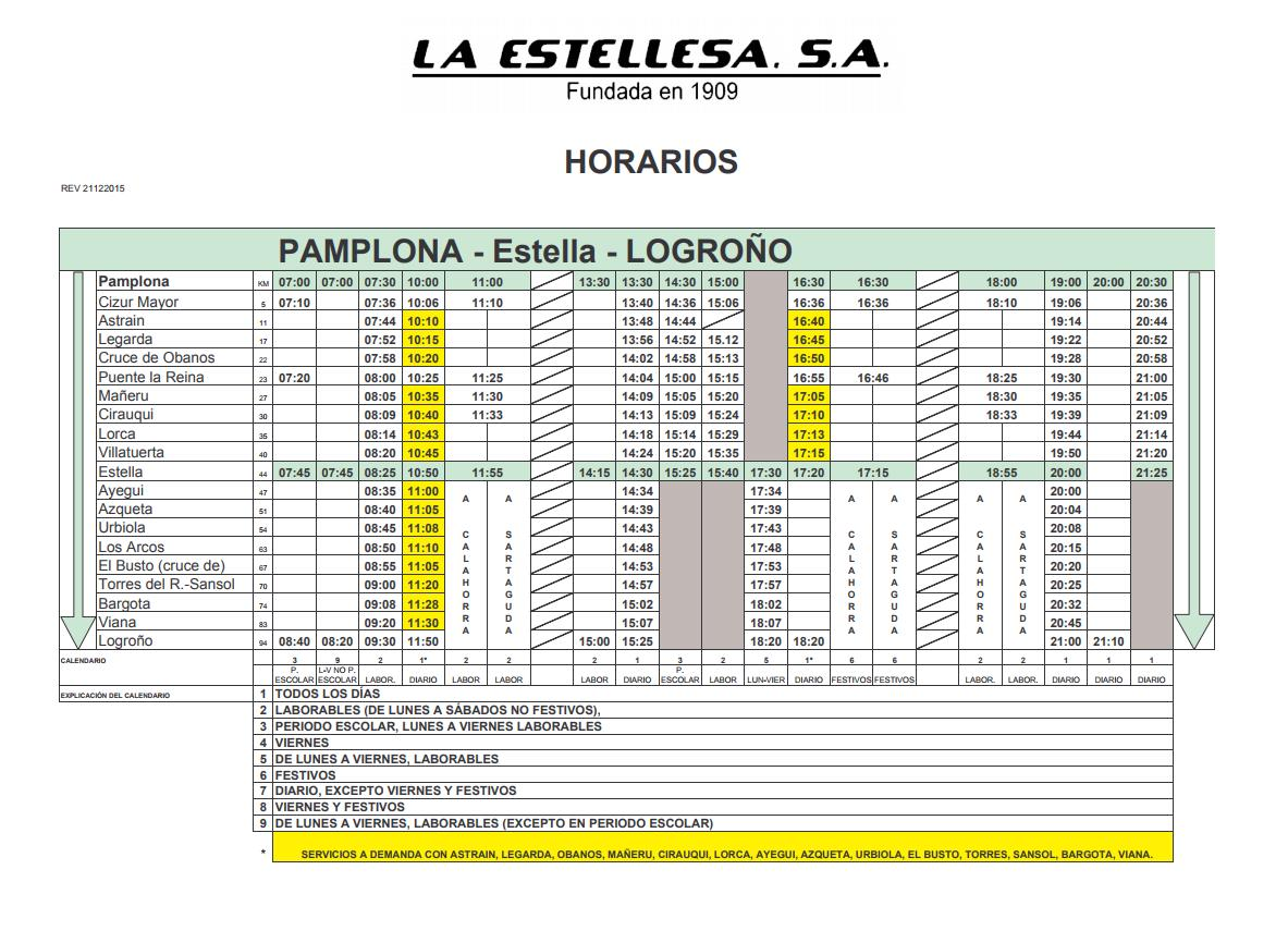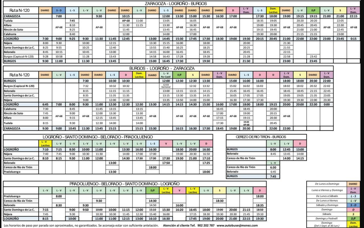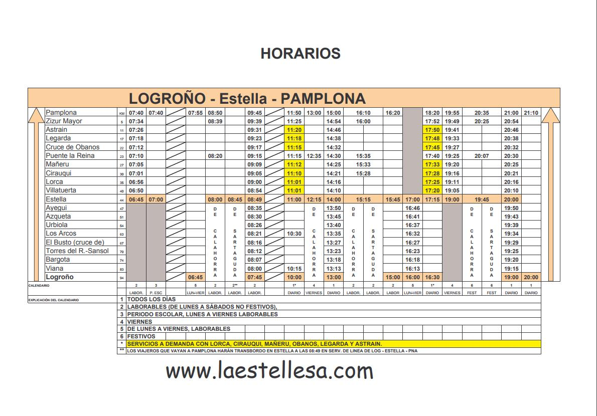 Madrid행 PLM버스가 운행하며, 시간표에 따라 완행과 직행으로 가는 버스가 있으니 상황에 따라 선택하면 된다. 단 Belorado까지 운행하지만 Burgos까지는 가지 않는다. 따라서 Belorado에서 환승 또는 그 이전 Logrono에서 Burgos행 버스를 탑승하는 것이 낫다. Pamplona를 출발하여 순례길 위치에 있는 도시로 운행하는 ALSA 버스는 없다.