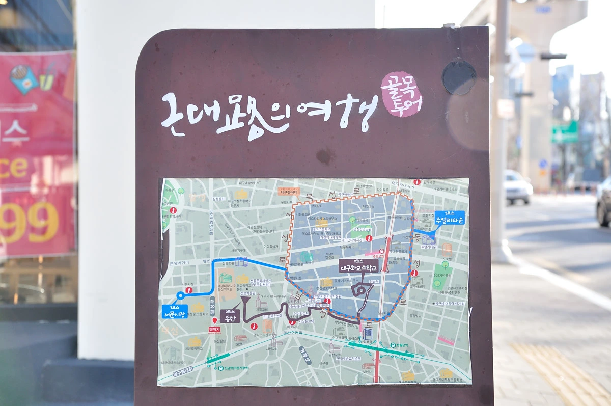 두 번째, 부족한 안내표시판이다. 나름 코스 중간에는 방향이정표가 있지만 이또한 골목길을 헤매다 발견하게 된다. 골목길여행을 다니는 사람들은 대부분 대중교통을 이용하여 찾아온다. 출발지가 대중교통이 용이한 지하철역 또는 대구역에서 시작한다면 찾아오는 관광객들에게 쉽게 대구시내를 보여주고 편안함을 줄 것이다.