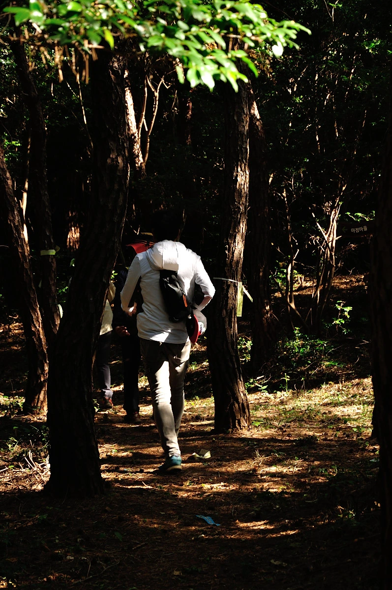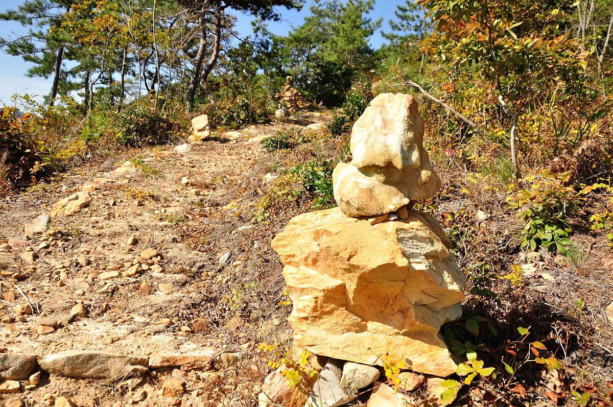 곳곳에 돌을 쌓아 만든 돌탑도 보였고 무엇보다 스탭인 듯한 분이 뛰듯이 앞뒤로 오가며 참석자들을 안내하고 다닌다. 그렇게 안해도 잘 찾아갈 수 있을텐데 말이다. 5km라고 하지만 숲길에 자잘하게 오르막과 내리막이 있어 어느새 땀이 흘렀고, 그늘 가득한 숲에 들어서면 편백나무와 삼나무, 소나무가 어울려 상쾌한 향을 뿜어낸다.