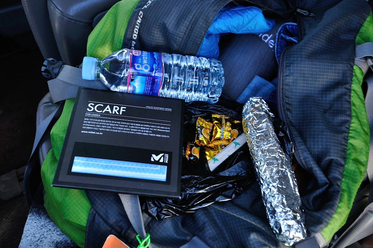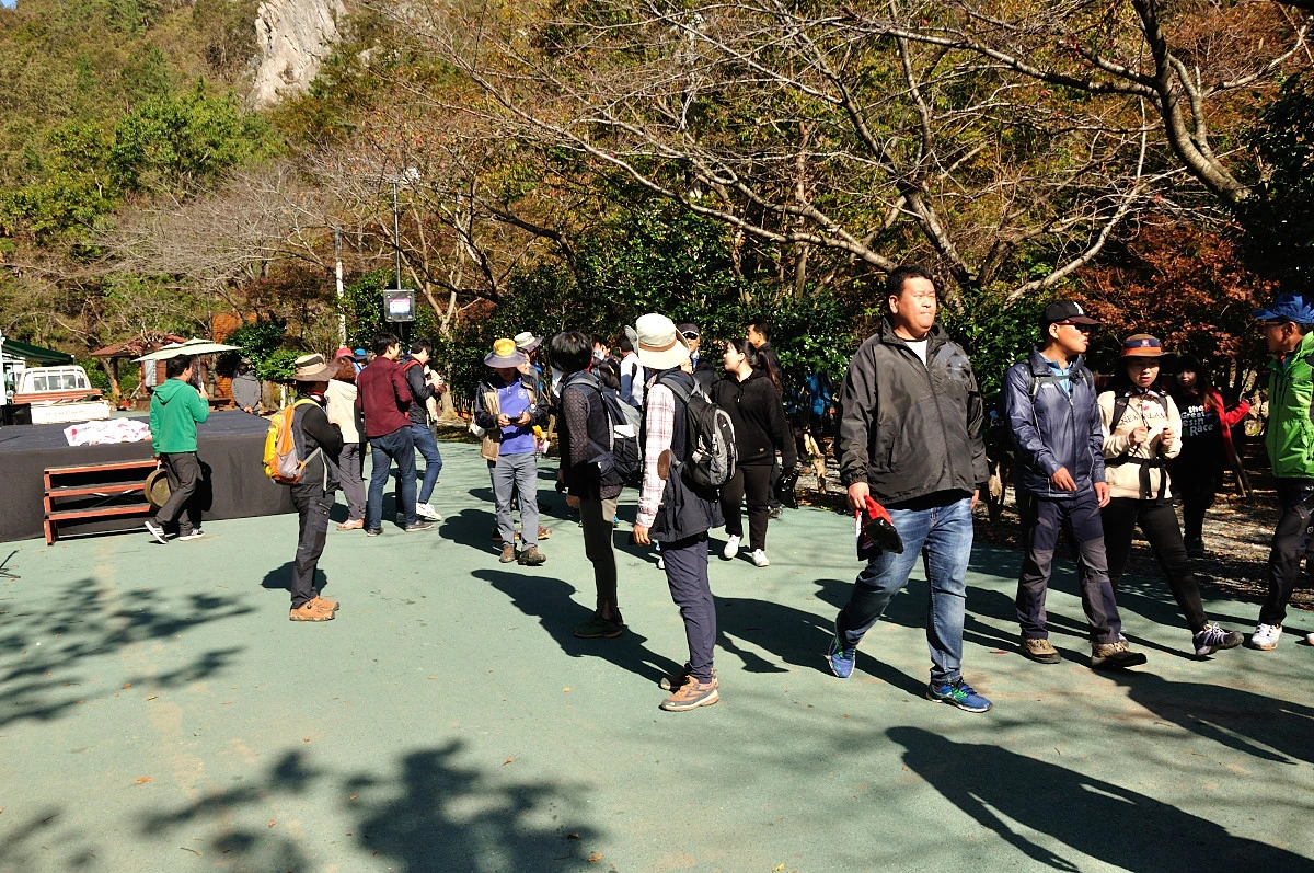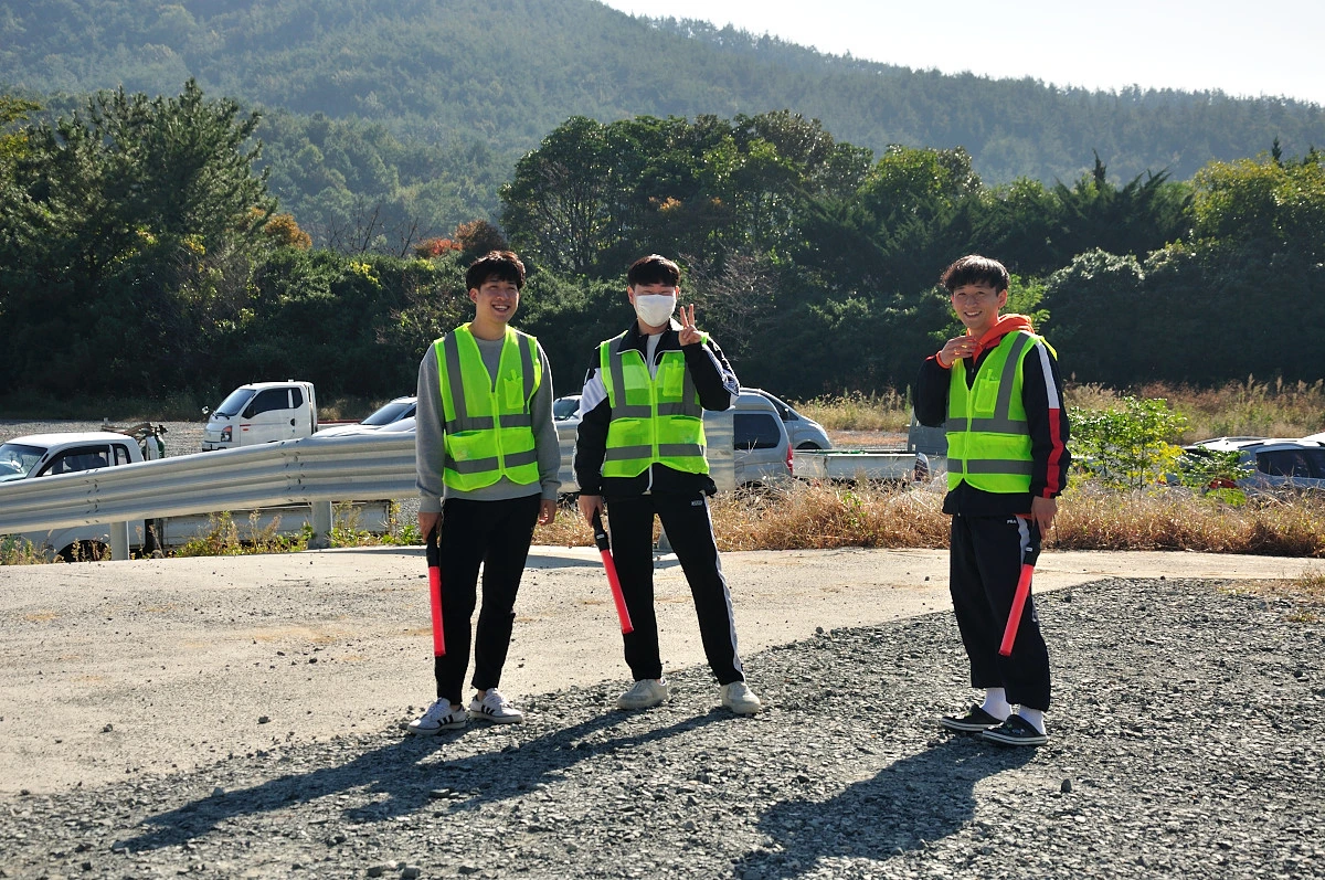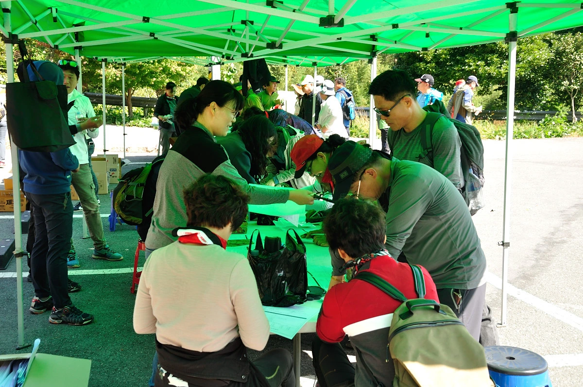 걷기축제가 열리는 장소로 내려오니 사전접수를 한 후 비닐봉지 하나를 건네준다. 여기에 간식으로 김밥과 사탕, 식수 그리고 손수건이 기념품으로 담겨 있었다. 생각보다 많이 준비한듯하다. 주차장부터 축제장주변에 군데군데 애띤 모습을한 청소년들이 우리가 잘 찾아 갈 수 있도록 봉사요원으로 군데군데 서있었다. 사진을 찍으려고 하니 V자를 그리며 씩 웃어준다.