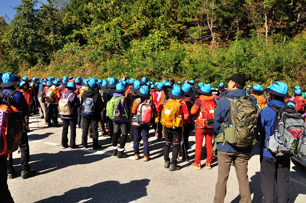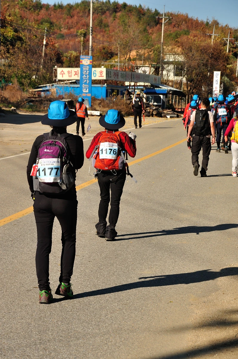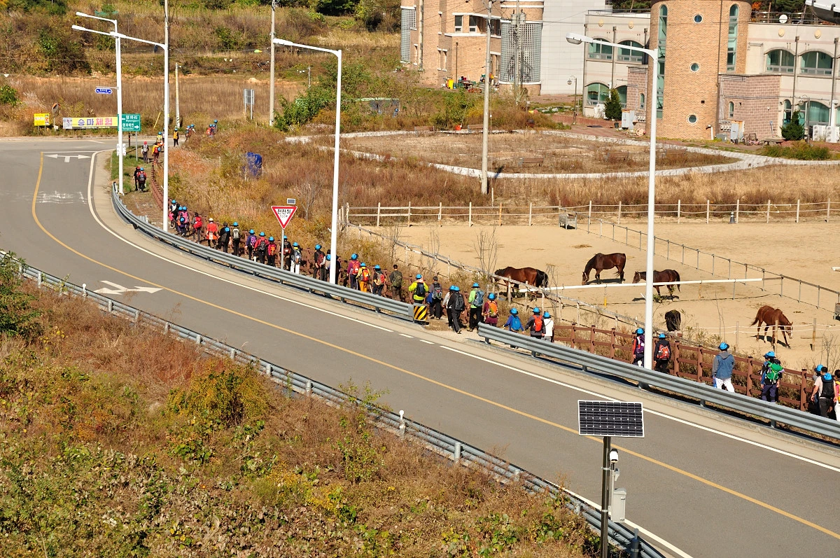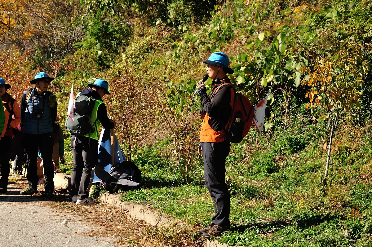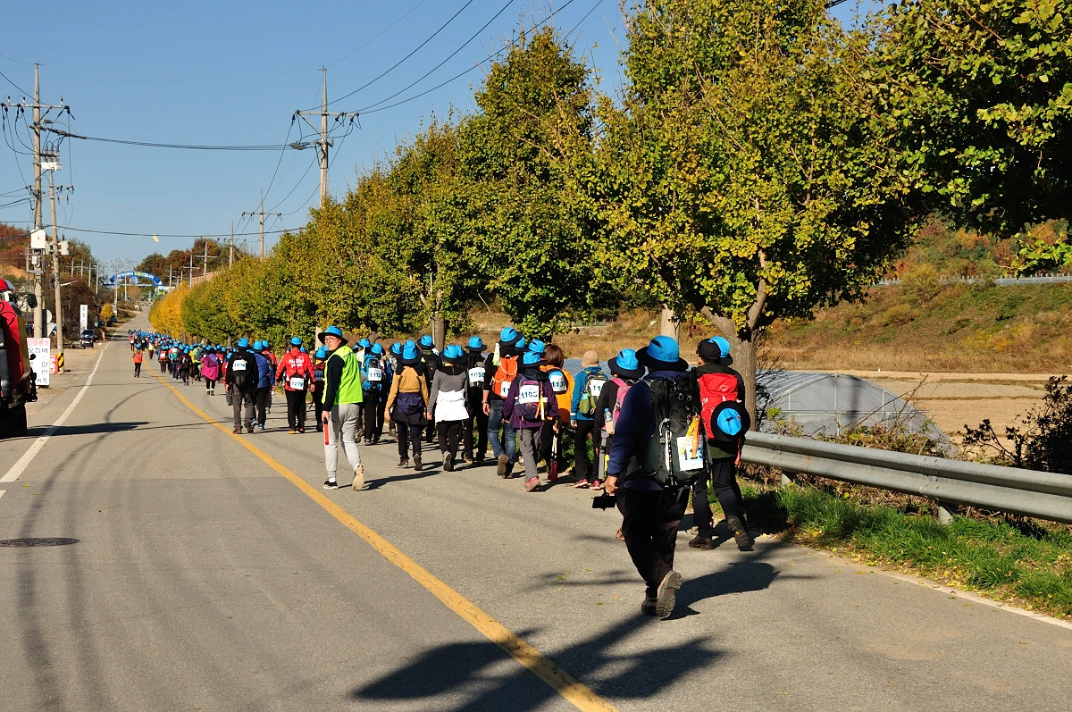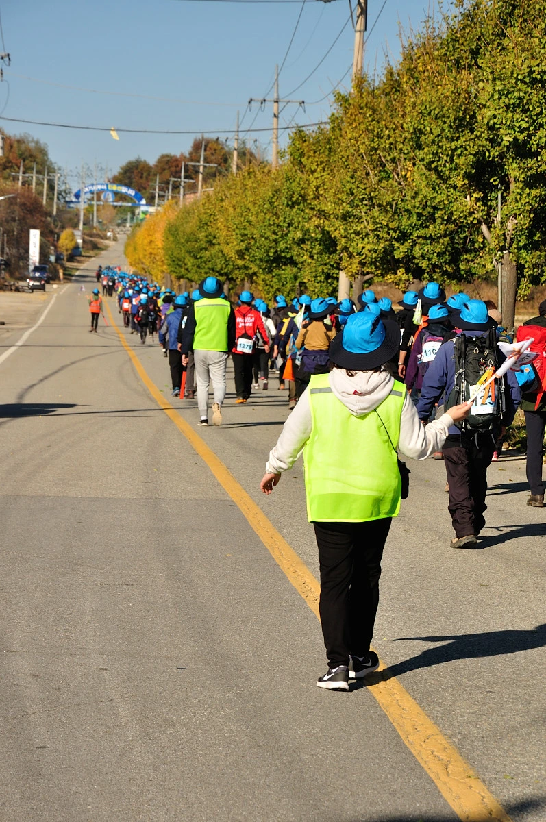버스 주차장 한 켠에서 행사를 시작한다. 짧고 간결하게 주최자측에서 안내 인사를 건네고 오늘 걸어갈 코스에 대해 이야기를 들려 준다. 주변에는 야광빛 조끼를 입은 안내요원들이 늘어서 있다. 버스를 타고 온 사람들은 대부분이 걷기동호회에서 모집하여 참석한 인원처럼 보였다. 익숙한 동호회 패찰도 보였다. 모두가 걷기를 즐기는 사람들이니 오늘같은 행사에는 적합한 참여자인지도 모르겠다. 그래서 인지 참석한 사람들의 얼굴에는 가벼운 흥분감과 즐거움을 담은 미소가 번지고 있었다.