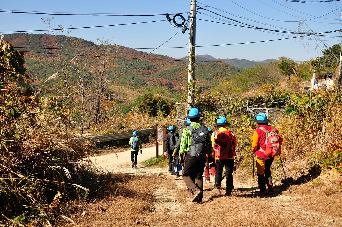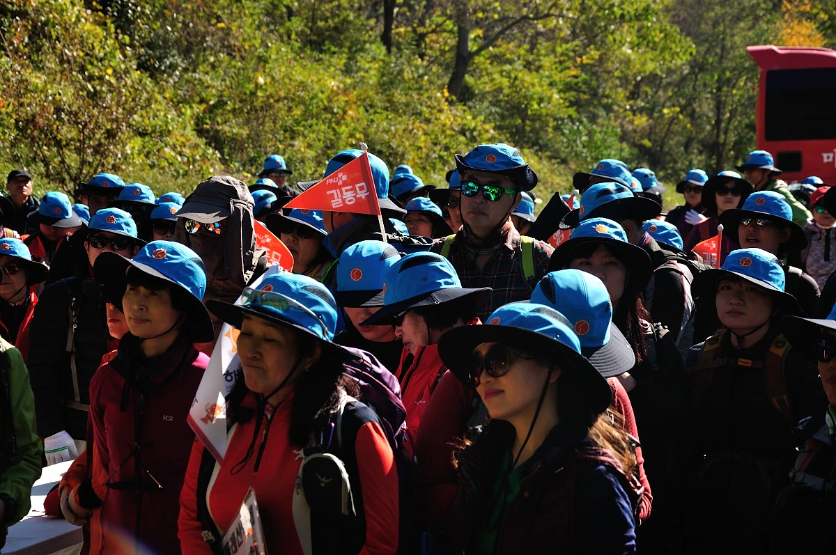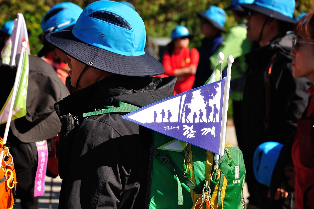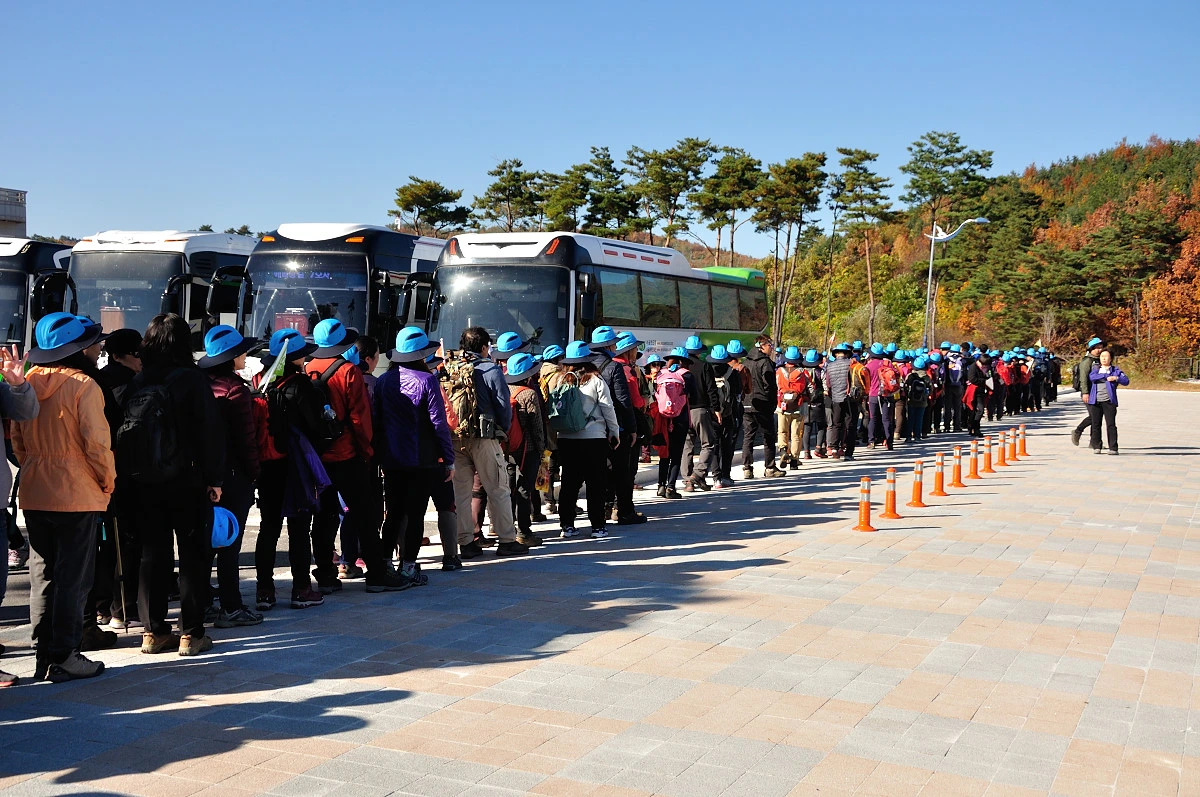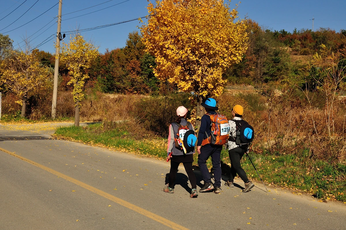 버스 주차장 한 켠에서 행사를 시작한다. 짧고 간결하게 주최자측에서 안내 인사를 건네고 오늘 걸어갈 코스에 대해 이야기를 들려 준다. 주변에는 야광빛 조끼를 입은 안내요원들이 늘어서 있다. 버스를 타고 온 사람들은 대부분이 걷기동호회에서 모집하여 참석한 인원처럼 보였다. 익숙한 동호회 패찰도 보였다. 모두가 걷기를 즐기는 사람들이니 오늘같은 행사에는 적합한 참여자인지도 모르겠다. 그래서 인지 참석한 사람들의 얼굴에는 가벼운 흥분감과 즐거움을 담은 미소가 번지고 있었다.