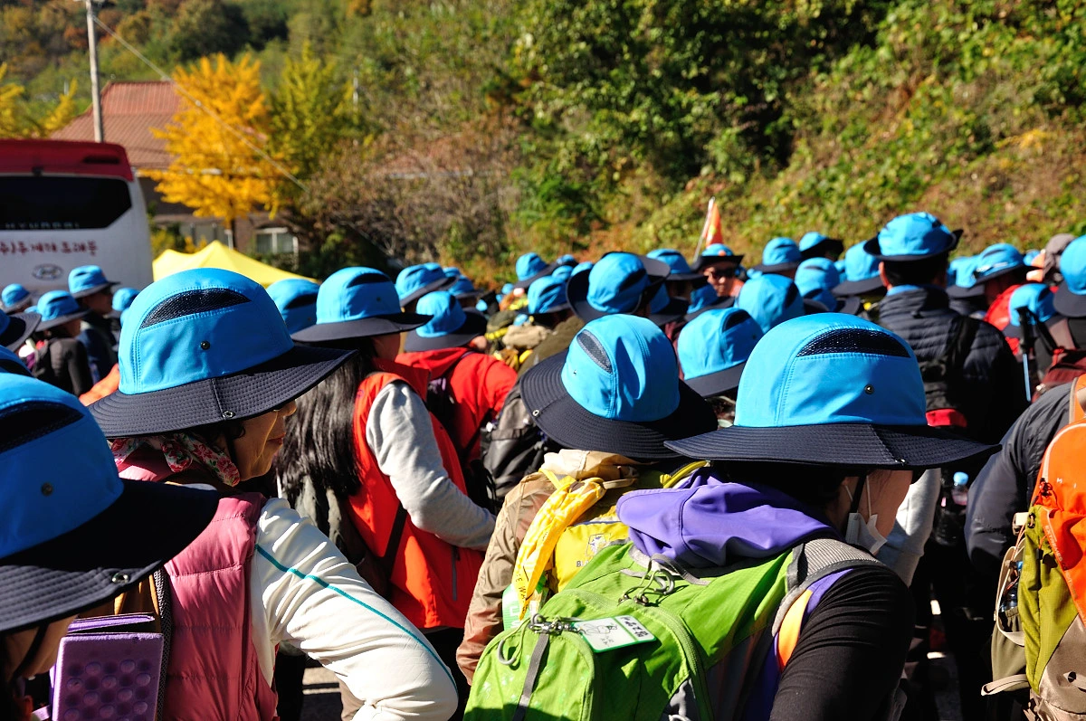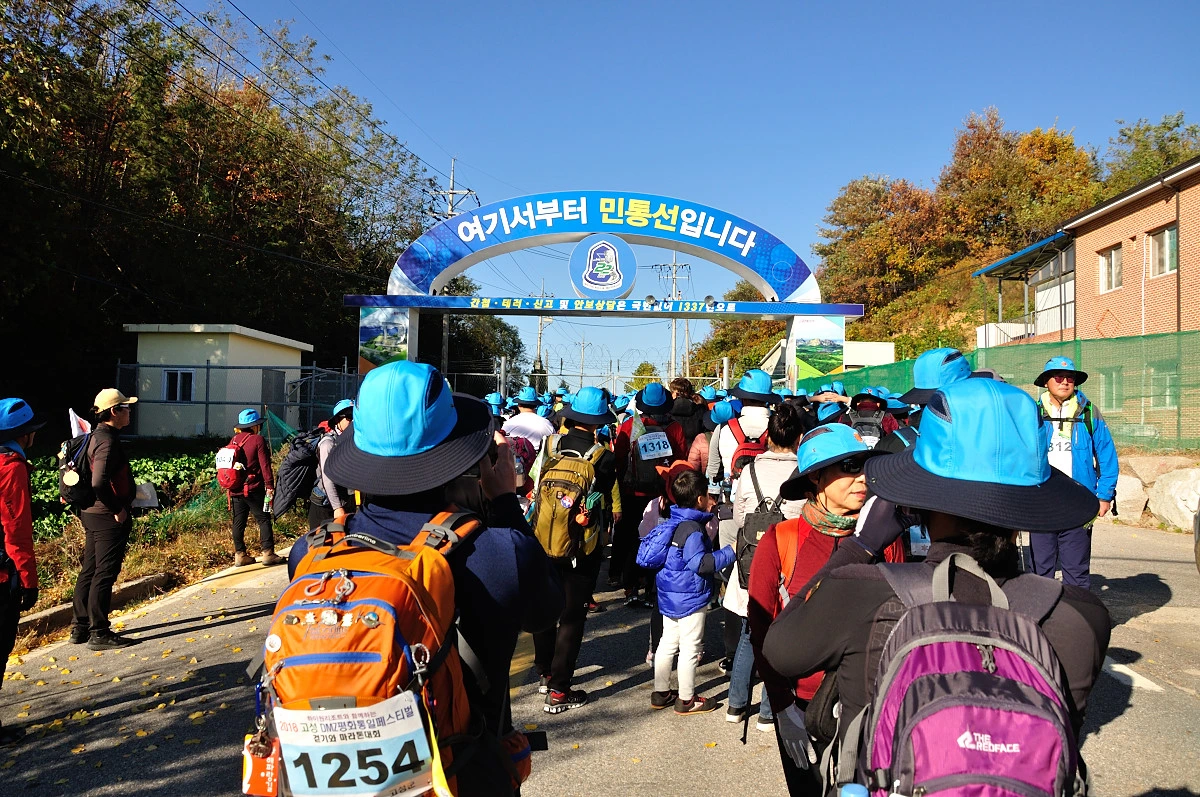 통일전망대에 다다라서야 다시 셔터를 누를 수 있었다. 역시나 좁은 길로 파란색 점이 줄지어 걸어올라가고 있었다. 단순한 기념품인 모자 하나가 만들어 놓은 풍경이다. 그리고 질서있게 움직이는 참석자의 모습이 더해져 이러한 멋진 풍경을 만들어 내고 있다. 수많은 사람들이 모이는 곳에서 조용게 자기 순서를 지키며 대기하는 축제가 몇 개나 있을까 싶다. 그동안 다녀왔던 걷기축제는 다양한 모습은 존재하지만 질서정돈의 모습은 보이지 않았다. 너무나 많은 사람들이 다른 생각을 가진 사람들이 모여있으니 말이다. 하지만 고성에서 만난 걷기 축제에 참가한 사람들은 같은 생각일 것이다. 걷는것이 즐겁고, 해파랑길을 걷고 싶어하고, 조금만 늦어도 여유라고 생각하는 배려를 모두가 품고 있기 때문이 아닐까 싶다.