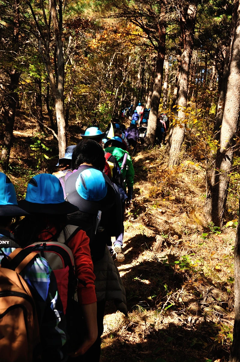 얼마나 걸었을까? 뒤에서 나를 부르는 소리가 들린다. 뒤돌아 보니 예전 걷기여행 카페에서 알고지내던 회원을 만났다. 역시나... 이 많은 사람들 중에 나를 아는 사람이 있다는 것이 신기하였다. 그분과 이런 저런 얘기를 나누며 걸었다. 숲길은 계속 조금씩 올라가기만 했다. 제법 길 숲길이다. 그런게 마냥 걷기만 하는게 나한테는 아쉬웠다. 이렇게 좋은 숲에서 쉬지도 않고 가야 하니 말이다. 어느새 길 위에서 또다른 지인을 만났다. 홀로 여기에 왔지만 어느새 혼자가 아닌 어느 동호회에서 온것같은 느낌을 받았다. 그 동안 나와 인연을 가지고 만나왔던 사람들이 무척이나 많았음을 느끼고 있다.
