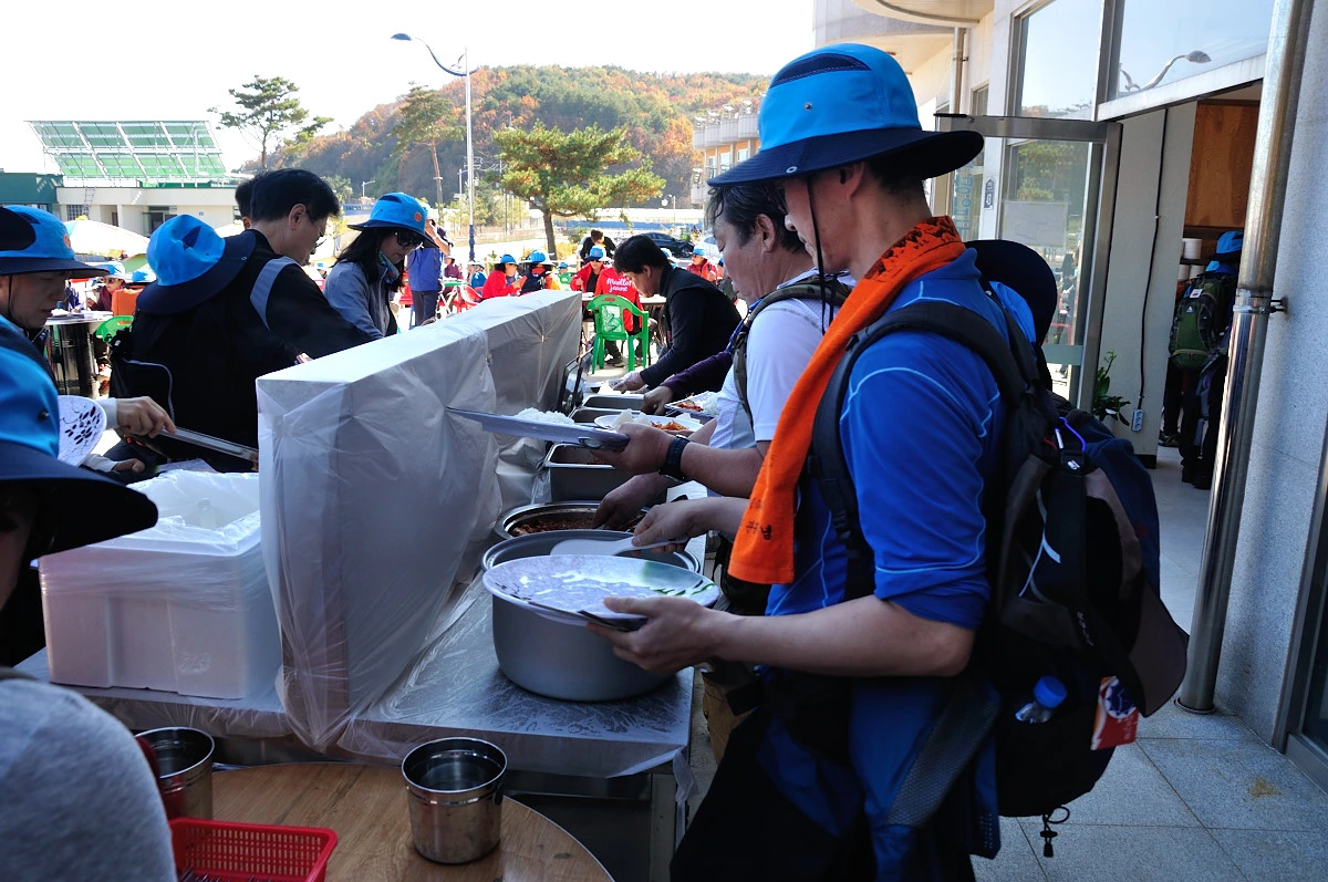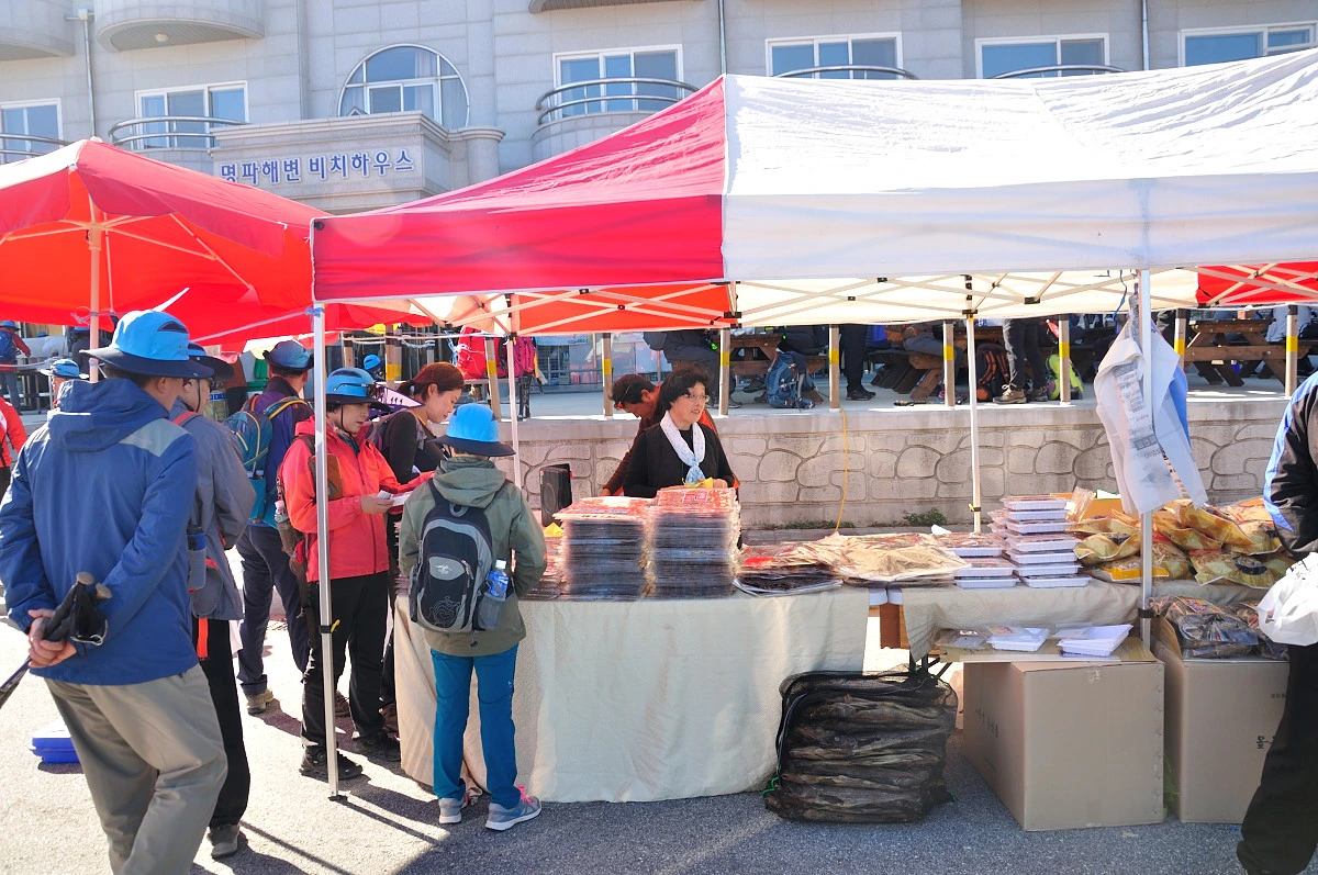 어느새 숲길이 끝나고 넓은 도로가 내려다보이는 계단앞에 다다랐다. 여기가 명파해변이 있는 곳이고 점심식사를 하는 장소로 가는 초입이다. 넓은 국도는 북쪽으로 향하는 7번 국도이다. 어디까지 이어지지는 모르겠으나 왠지 금강산까지 금방 갈 수 있을것같은 기분이 든다. 명파해변에 다다르니 마을 부녀회에서 준비했다는 점심식사가 부페식으로 준비되어 있었다. 나보다 한참 앞서 갔던 사람들은 줄을 서거나 아니면 벌써 식사를 하고 있었다. 구수한 국냄새와 제육볶음 냄새가 나를 유혹하였다. 길게 늘어선 줄이 줄어들지 않는것만 같았다.