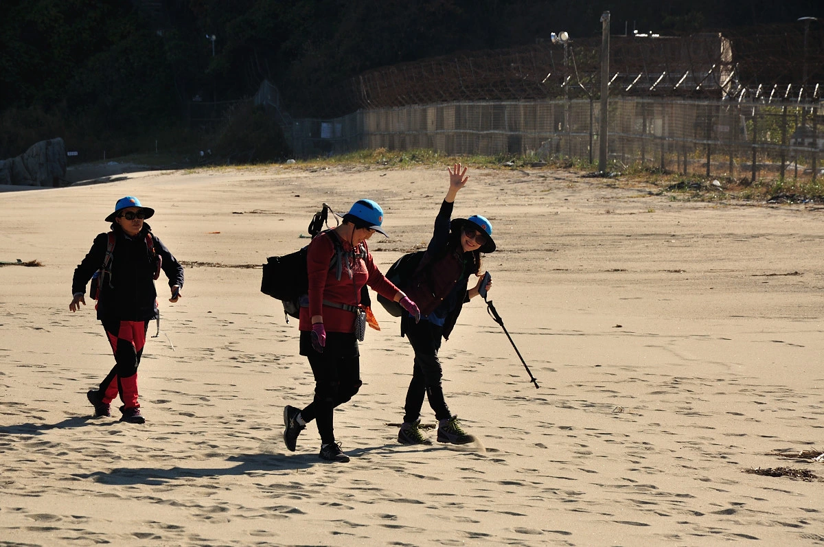 철책선을 뒤로하고 우리는 명파해변으로 가는 산길로 접어들기 시작했다. 둘레길이라고는 하지만 도로보다는 낮은 산으로 접어들어 가는게 안전하고 걷기에 편하다. 하지만 여기 낮은 산은 둘레길이라기 보다 등산로처럼 꽤 많은 계단을 밟고 올라서야 했다. 좁은 오솔길에 파란색 점이 줄지어 올라서고 있었다. 헉헉거리는 숨소리도 들렸고 친한 사람들끼리 주고받는 대화소리도 들여왔다. 여기서는 철책선도 바다도 보이지 않았다. 대신 녹음 가득한 소나무숲이 우리를 에워싸고 있었다. 1열로 늘어선 줄은 시작도 끝도 보이지 않았다. 끊임없기 사람들이 걸으면서 목적지를 향해 걸었다.