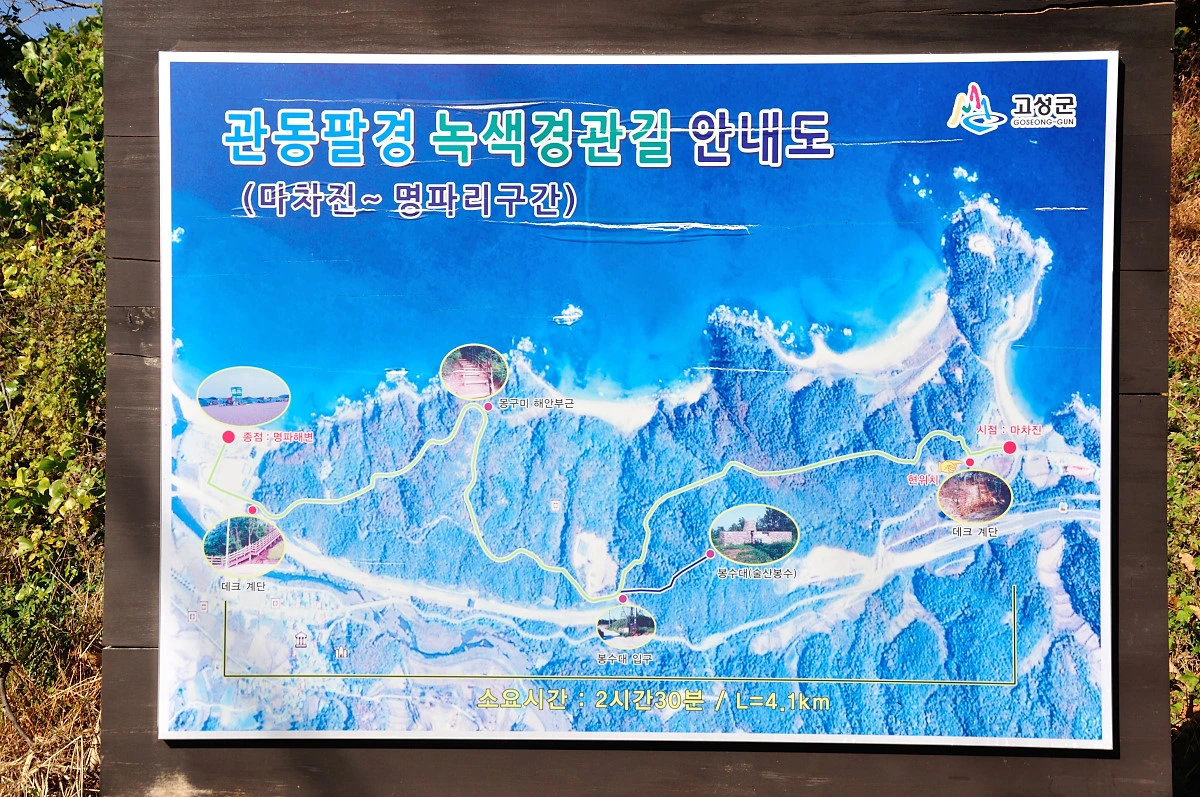 해파랑길은 기본적으로 새롭게 조성한 길은 아니다. 기존에 동해안에 인접한 지자체에서 만들거나 조성한 둘레길의 일부를 차용하고 이어서 만든 길이 해파랑길이다. 그래서 조성하는데 오랜 시간이 필요하지 않았다. 대신 부족한 상황에서 급히 개통하려고 했는지 몰라도 이정표가 부실하거나 코스안내가 부족하여 헤매는 경우가 많았다. 게다가 기존 둘레길 이정표위에 해파랑길 표시를 부착하다보니 이해가 되지 않은 사람들에게는 또다른 오해를 만들어 낼 수 밖에 없었다. 전혀 다른 길처럼 보였을테니 말이다. 이곳 고성구간도 관동팔경을 주제로한 둘레길이 있었는데 이를 이용하여 길을 내었다. 그래서 관동팔경 안내표시판위에 해파랑길 표식이 붙어 있다. 이렇게 만들었다면 길명칭을 통합하는 것도 중요할텐데 그렇게까지는 하지 않는걸 보면 걷는 사람이 중요한게 아니라 길을 조성하고 만든 단체가 주인이라고 생각하는 듯 싶다.