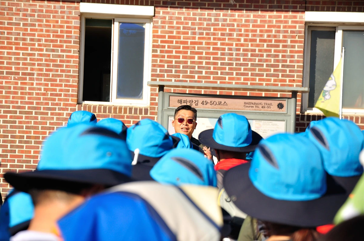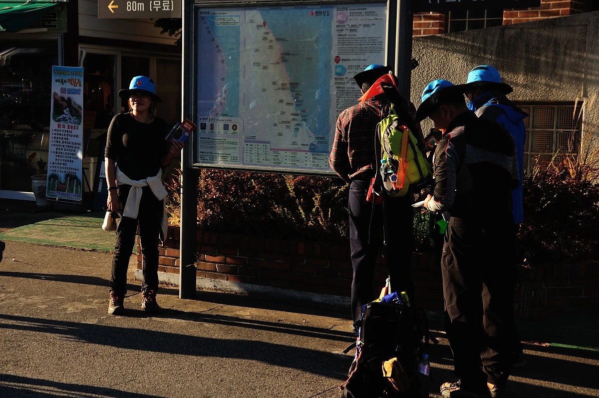 조금이라도 빨리 출발하기위해 미리 엔진을 가열하고 엑셀레이터를 밟으며 준비하는 자동차처럼 여기에 모인 사람들도 살짝살짝 움직이며 빨리 걷기위해 다리를 예열하는 모습이 군데군데 보였다. 안내가 끝나자 서서히 많은 인원이 움직이며 해파랑길을 걷기 시작했다. 나또한 뒤에서 사진을 찍으며 사람들의 모습을 바라보며 따라나섰다. 왠지 오늘은 여기서 아는 사람을 만날것 같은 예감이 들었다. 그 예감은 틀린적이 없지만...
