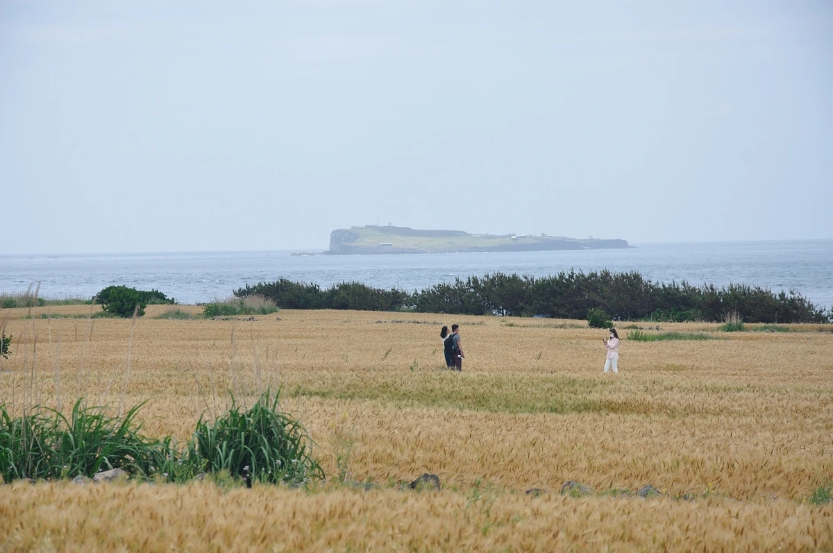 가파도 또는 안성의 너른 청보리밭을 가고 싶어하는 사람들이 많다. 가파도 청보리밭도 유명하기에 많은 사람들이 찾는다. 섬의 대부분 면적이 밭인데 거기에 보리가 심어져 있다. 겨우내 찬기운을 이겨내고 봄부터 자란 보리는 5,6월이며 익어서 수확하게된다. 그 전에 싱싱한 초록빛 가득한 보리밭은 멋드러진 풍경을 보여준다. 조금 늦은 5월 중순에 찾아간 가파도는 노랗게 잘 익어있는 황금보리밭으로 변해 있었다. 제주의 토종 품종이라는 가파도 보리는 다른 지역에 비해 키가 커서 사람들이 보리밭에 들어가도 허리를 훌쩍 넘는 큰 키를 자랑한다. 선착장에서 내려 바로 사람들 사이를 헤집고 나아가 보리밭이 보이는 곳으로 빨리 걸어갔다. 좀더 빨리 가파도의 풍경을 접하고 싶기 때문이다. 작고 평평한 섬 사방을 둘러봐도 누렇게 익은 보리밭이 펼쳐져 있다. 바다너머에는 산방산과 송악산이 오른편에 보이고 왼편을 보면 모슬포와 비양도가 작게 눈에 들어온다.