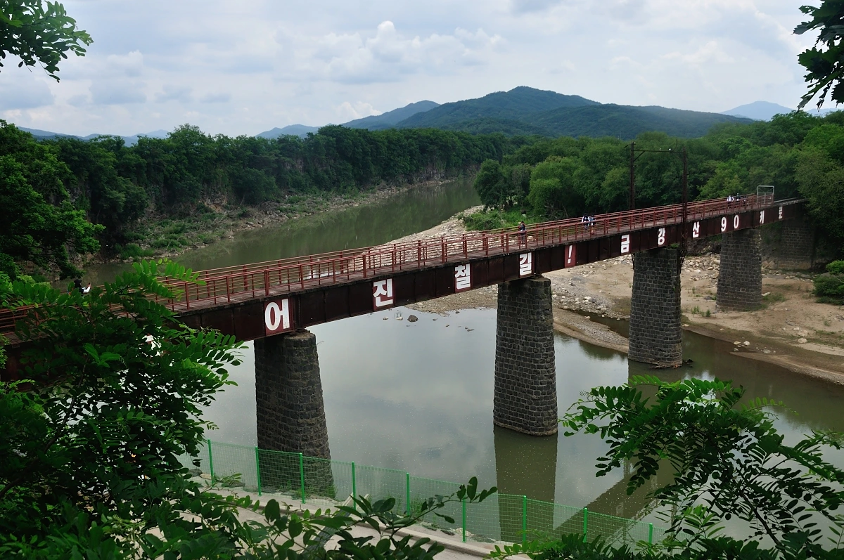 화강을 벗어나 도창리로 접어든 후에 점심식사를 하였다. 근처네 옛 금강산가는 기차의 철교가 있던 곳이라하여 식사 후 둘러보기위해 여기로 정했다고 한다. 식사를 마치고 철교가 있는 곳으로 잠시 이동했다. 좁은 협궤의 낡은 철로였다. 한탄강 특유의 절리가 있는 절벽을 가로지르는 철교를 보강하여 건널 수 있게 만들었다. 철교를 따라 북쪽으로 올라가면 금강산까지 이어진다는 이철교는 지도에도 보이지 않는다. 그저 낡은 철교만 남아있어 기차가 다녔음을 상기시켜준다. 신기하게도 이철교는 전기동차가 다녔다고 한다. 디젤이나 증기전동차가 아닌 전차처럼 전기를 동력으로 삼는 전기동차가 다녔다는 것이 놀라웠다. 그래서 철교위에 보면 전기를 흘려보내는 전선을 설치했던 시설이 보인다. 짧은 시간동안 머물렀으나 여운은 길다. 기념사진촬영때문에 단체로 줄서서 있었지만 모두 떠나고 나서도 일부는 아쉬움을 덜기위해 둘러보고 둘러보고 있었다. 나또한 모든 사람이 다 빠져나갈때까지 기다렸다. 좁은 철교위에서 여운을 즐기고 싶었기 때문이다. 한탕강의 풍경도 멋지지만 여기에 철로가 있었고 기차가 다녔다는 것이 신기하면서 구슬펐다. 이제는 갈 수 없으니... 폐 월정리역에 가면 폭격을 맞은 기차가 있다. 그리고 그 옆에는 '철마는 달리고 싶다'라는 문구가 있다. 여기도 그런게 있어야 하지 않을까?