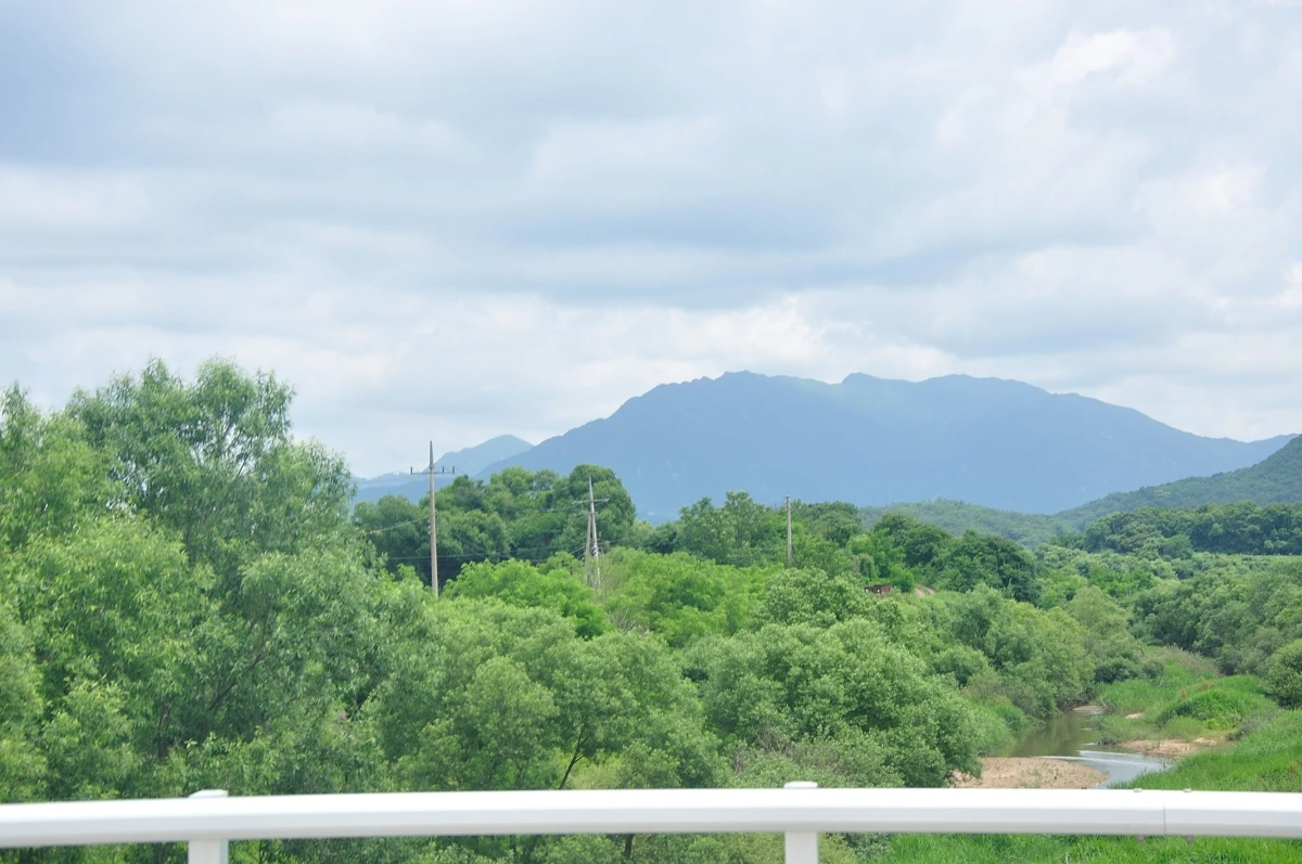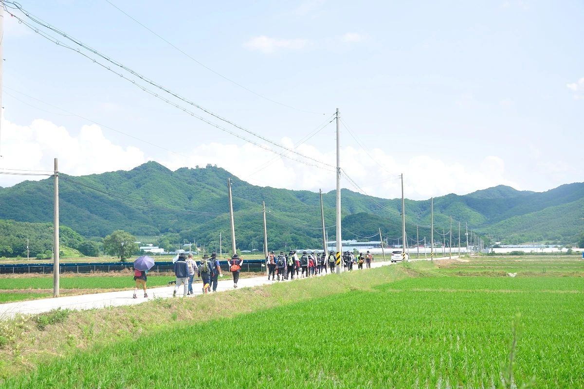 오늘 일정은 20여 km가 넘는 길이였다. 화강을 벗어난 다음부터는 땡볕에 노출된 마을길과 도로를 걸어야 했다. 우산을 쓰고 걷는데도 뜨거운 기운이 그대로 얼굴로 전해졌다. 땀과 섞여 피부는 점점 까맣게 변했다. 도착하고 나니 쉴 수 있다는 생각에 마음이 편해지고 자리를 잡는다. 데크가 부족하여 조장들은 파쇄석이 깔린 자리에 텐트를 쳐야했고, 일부는 데크위에 그늘막이 있는 곳을 선택받았다. 저런 그늘막마저 부럽게 느껴진건 처음이다. 숙소에서 정문을 향해 바라보니 철책선이 드리워졌다. 그리고 건너편 북녘땅과 오성산이 우리를 내려다 보고 있다. 누가 옆에서 말한다.