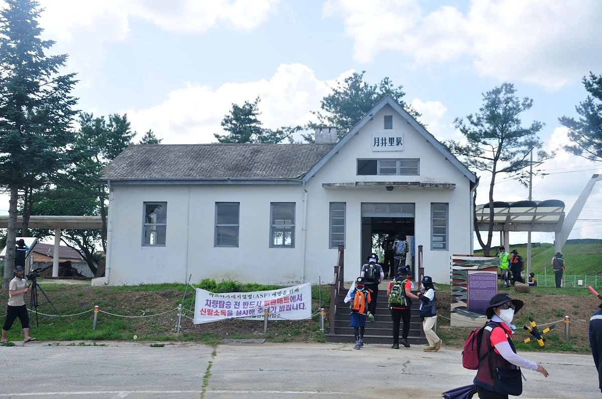 특별한 경험도 잠시 뿐, 우리가 가야할 목적지는 백마고지전적비까지이다. 아직까지 많은 거리가 남아있어 모두다 발걸음을 재촉한다. 두루미마을을 거쳐 철원의 평화전망대에서 점심식사를 한다고 한다. 뜨거운 햇볕을 가리기위해 우산을 받쳐들고 걸었지만 열기는 가시지 않는다. 얼굴에도 열이 올라 땀이 비오듯 내리고 얼굴은 벌겋게 타들어 갔다. 그래도 좋았다. 같이 걷는 조원이 있고, 남들은 갈 수 없는 곳, 볼 수 없는 곳을 나는 보았다는 자부심이 컸기 때문이다. 평화전망대에서 휴식을 취하고 점심나절에 버스킹 공연까지 보다보니 충분히 쉴 수 있었다. 발바닥은 물집이 더 생기고 열이올라 신발을 벗고 차가운 대리석바닥에 데고 식히는 것이 유일한 현재로썬 발바닥을 위한 유일한 방법이다. 그렇게 쉬고나서 우리는 아무나 갈 수 없는 소초가 이어진 길을 따라 남방한계선을 옆에 두고 걸었다. 철책선만 없었어도 얼마나 좋을까 하는 생각이 가득하다. 가로막는 철책선이 이렇게나 서글프게 보이다니... 월정리역에서 또 한 번의 휴식과 둘러보는 시간을 가졌다. 책에서만 보아왔던 녹슬은 기차가 보인다. 기차인지 알 수 없을 정도로 망가진 기차였으나 전쟁 시에도 끝까지 달리다가 폭격을 맞은 기차라고 한다. 여기서부터 더 갈 수 있었을 텐데 원래 경원선이 아니였던가? 서울부터 원산까지 이어졌던...