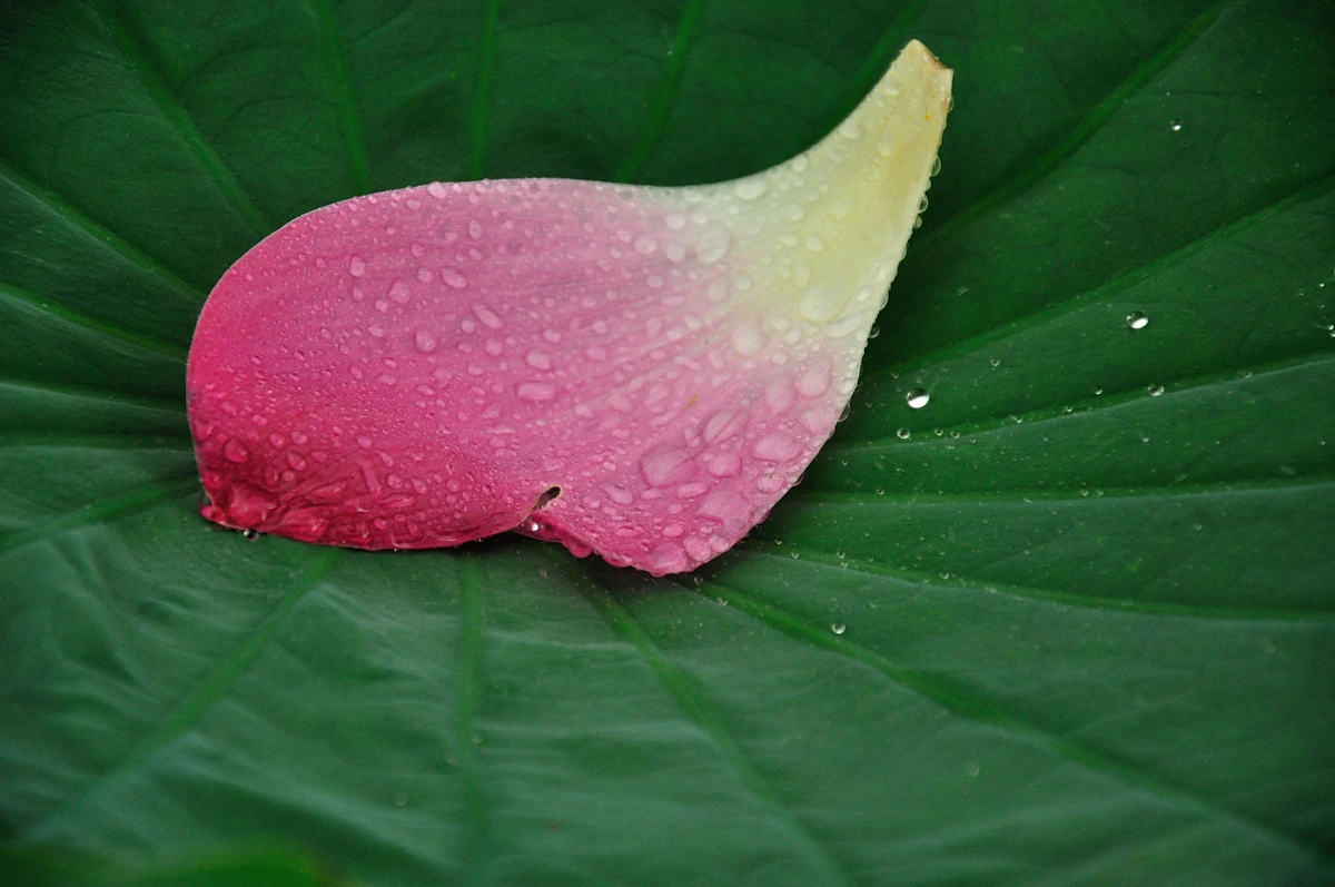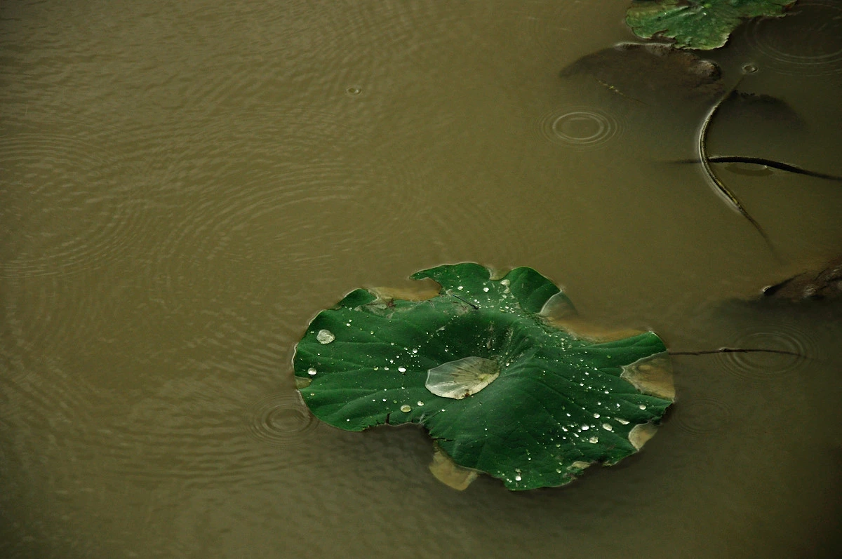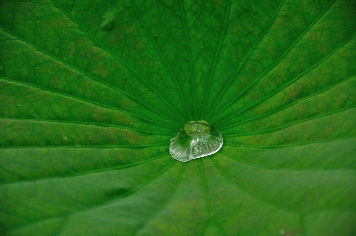 비가 내리는날 연잎에 빗방울이 하나둘씩 모여 커다란 물방울을 만든다. 연잎 자체가 도톰한데다 코팅된 기름종이 처럼 되어 있어 빗방울이 닿으면 퍼지는 것이 아니라 방울방울 모여 가운데로 모여든다.