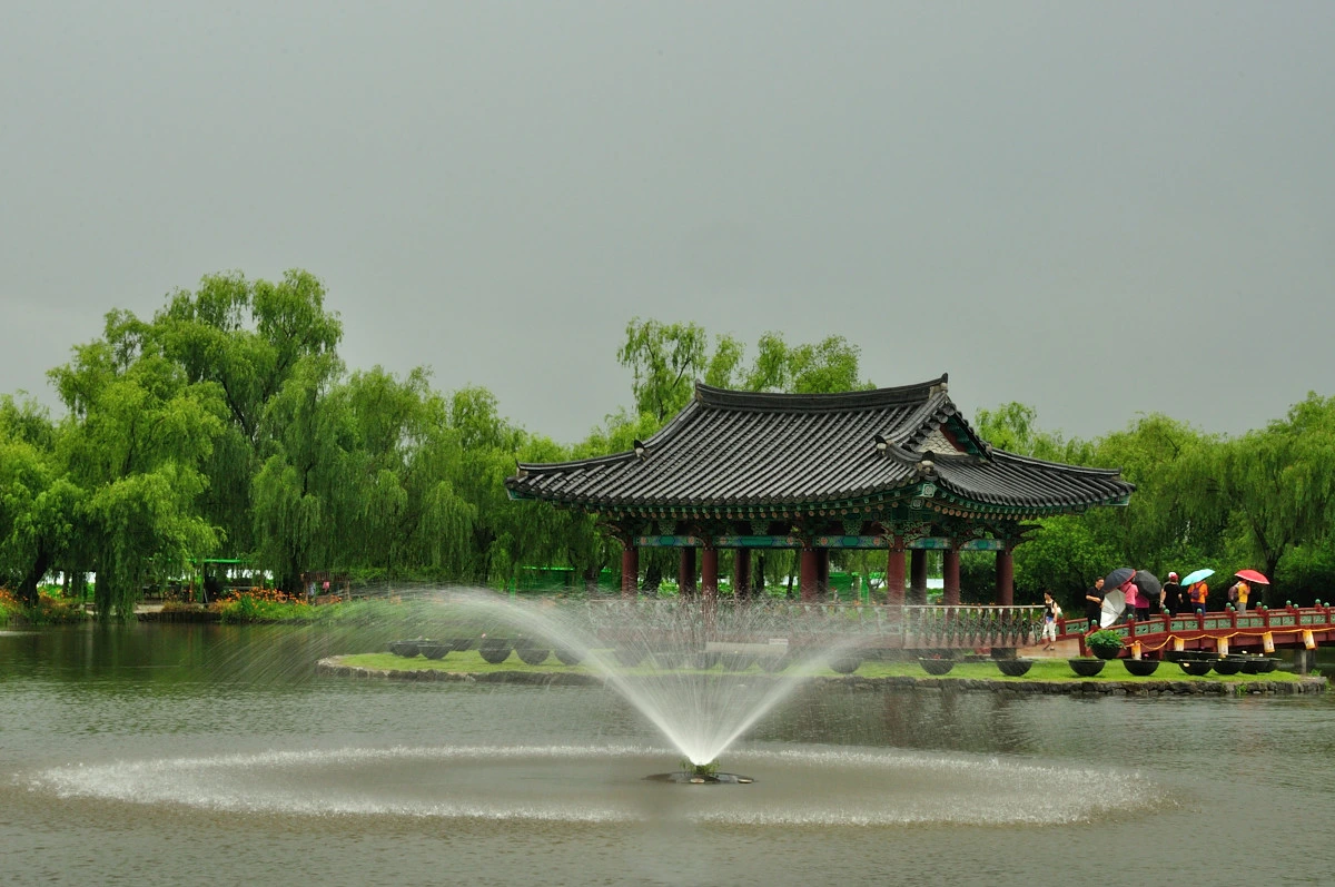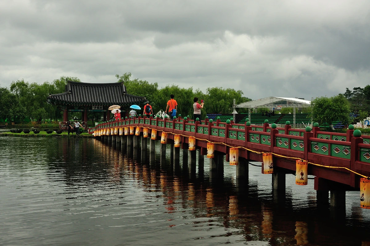 궁남지를 찿아야 하는 이유 중 하나는 목교를 건너 정자에 앉아 비도 피하고 시원한 바람을 맞으며 휴식을 취할 수 있기 때문이다. 예전에는 여기서 연회를 베풀었을 곳이지만, 지금은 길꾼이 쉬어가는 장소 정도 이다.