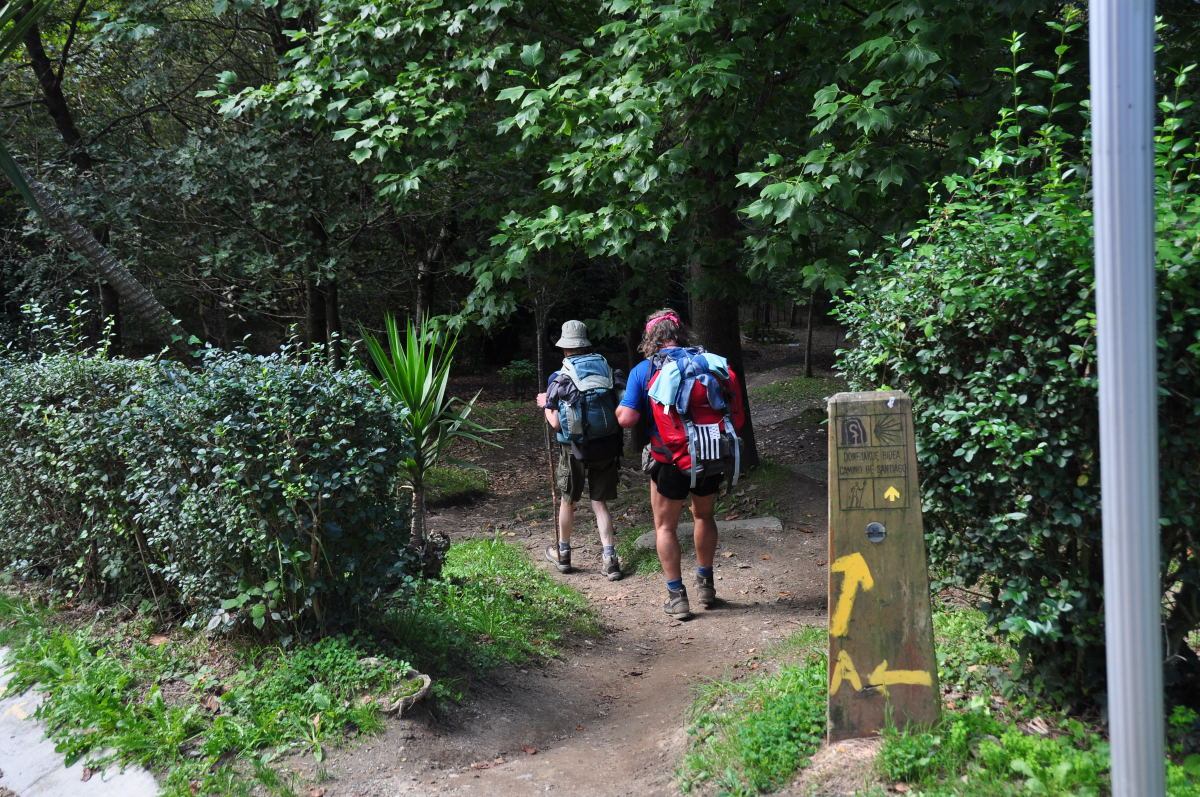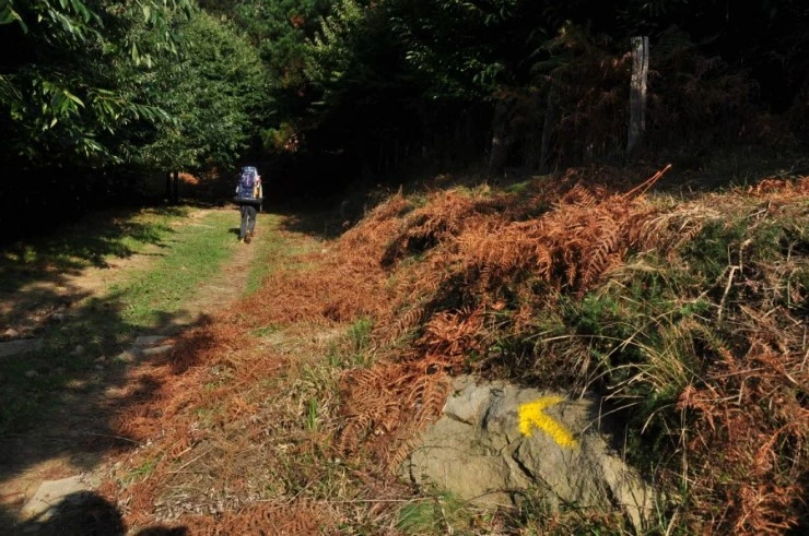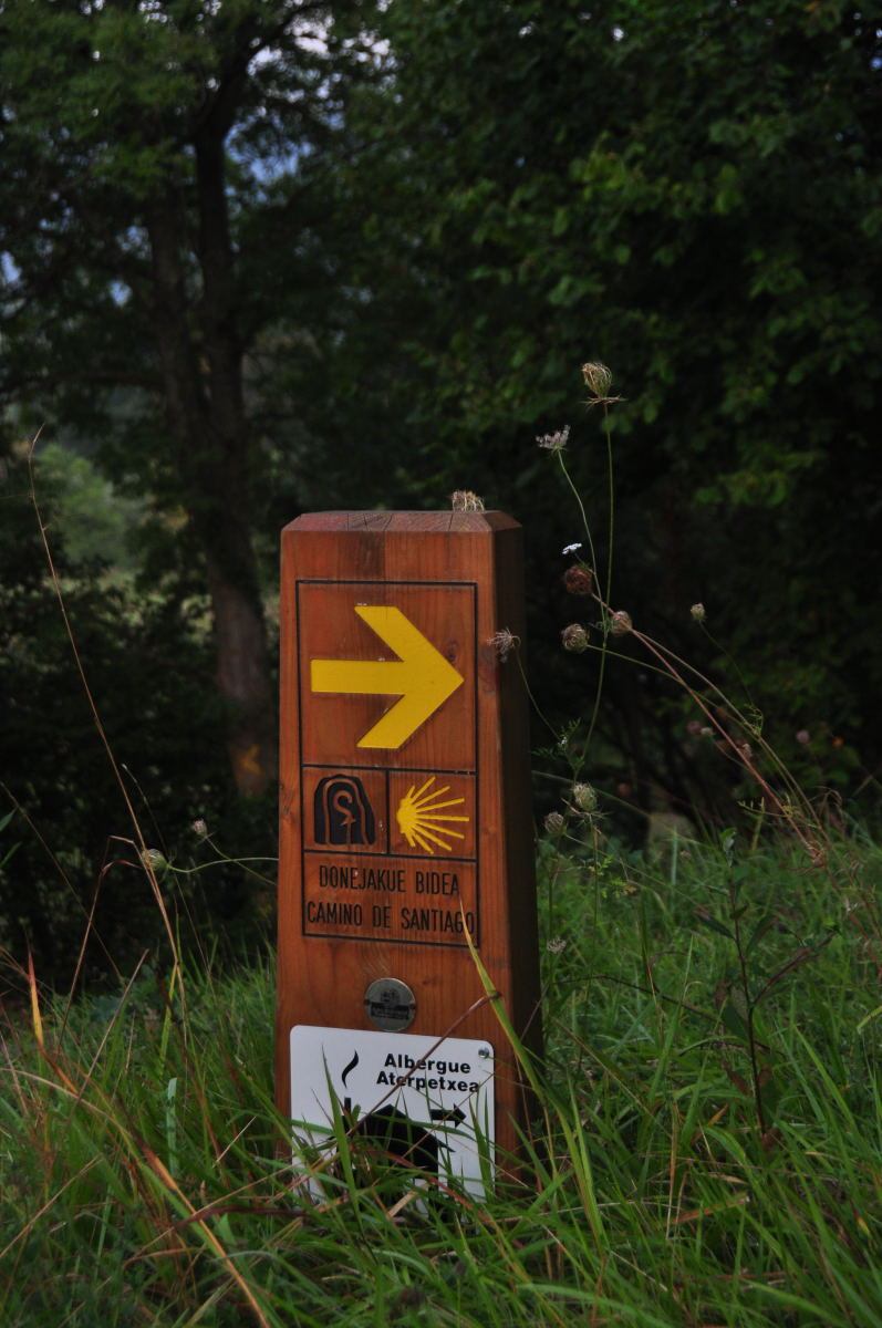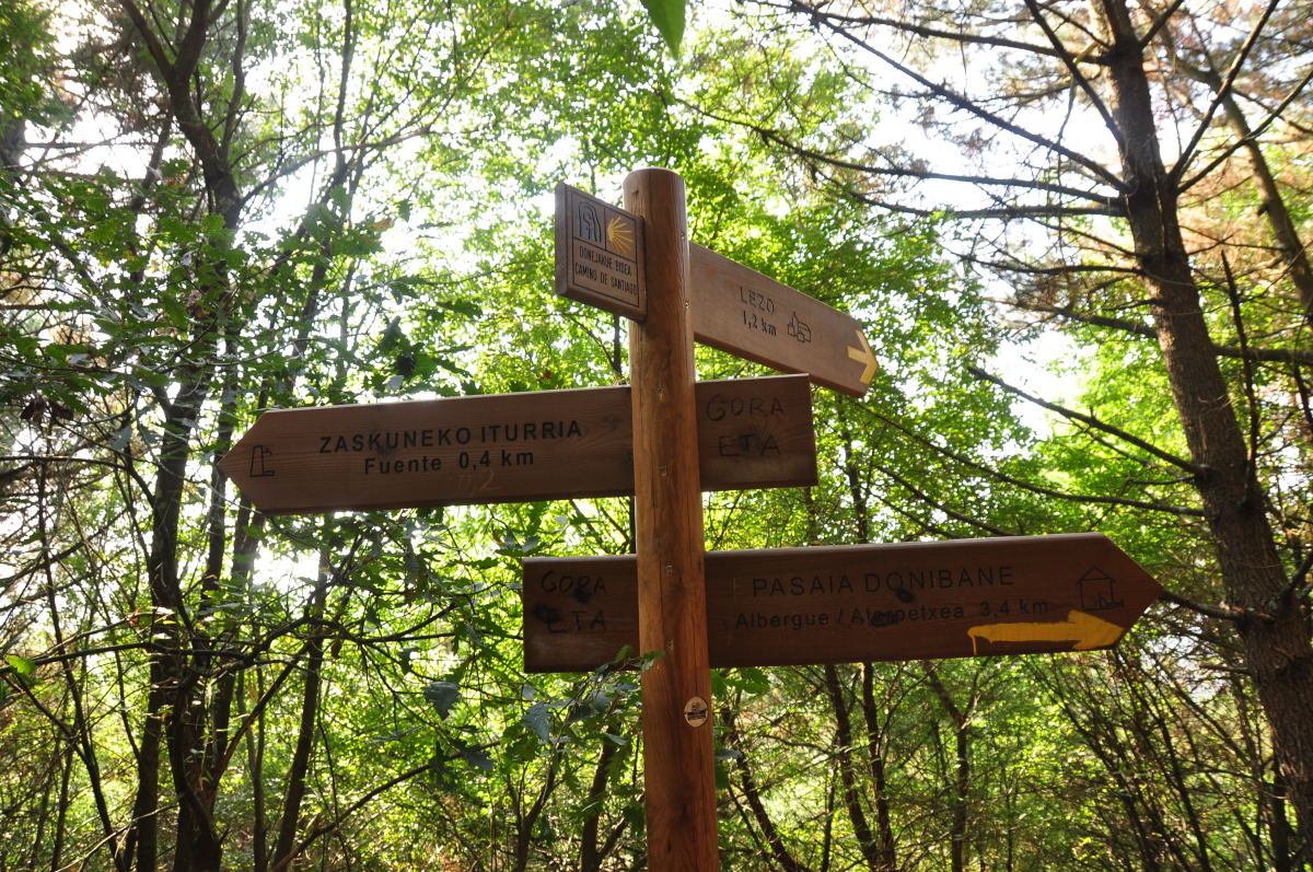Irun을 출발하여 약 13km정도 걸으면 숲길 중간에 갈림길 이정표를 만나게 된다. 숲을 가로질러 계속이어지는 숲속길과 숲을 벗어나 ‘Lezo’ 시내로 이어지는 갈림길 표시이며, 동시에 양쪽다 노란색화살표로 표시되어 있다. 다녀온 사람들 말로는 예전에는 Lezo마을로 이어지는 내리막길로 내려갔다고 한다. 아마도 새로 숲길 끝까지 이어지는 길이 만들어진 듯싶다. 어느쪽으로 가더라도 Pasai Donibaneko라는 작은 선착장에서 만나 배를 타고 해협을 건너야 한다. 한참후에 이 사진을 다시 보니 정식 루트는 Lezo마을로 내려가는 것이고 숲으로 가는것은 알베르게를 경유하여 길이라는것을 알았다.