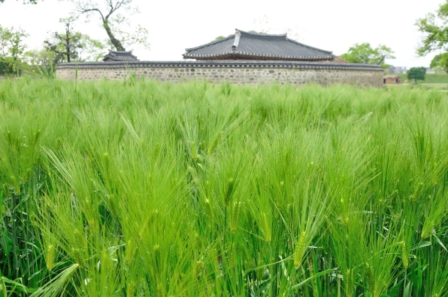 읍성 안에 돌다 보니 보리밭도 보인다. 푸른 보리밭과 그 뒤로 보이는 옥사 건물이 참 멋드러진다.
