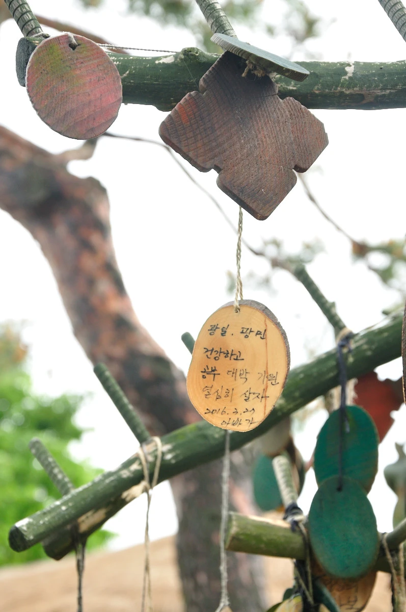 여기에도 소원나무라는 게 있다. 열쇠대신 나무조각에 글씨를 써서 소원을 비는 것이다. 수없이 많이 달려 있는 소원을 기원하는 문구들...