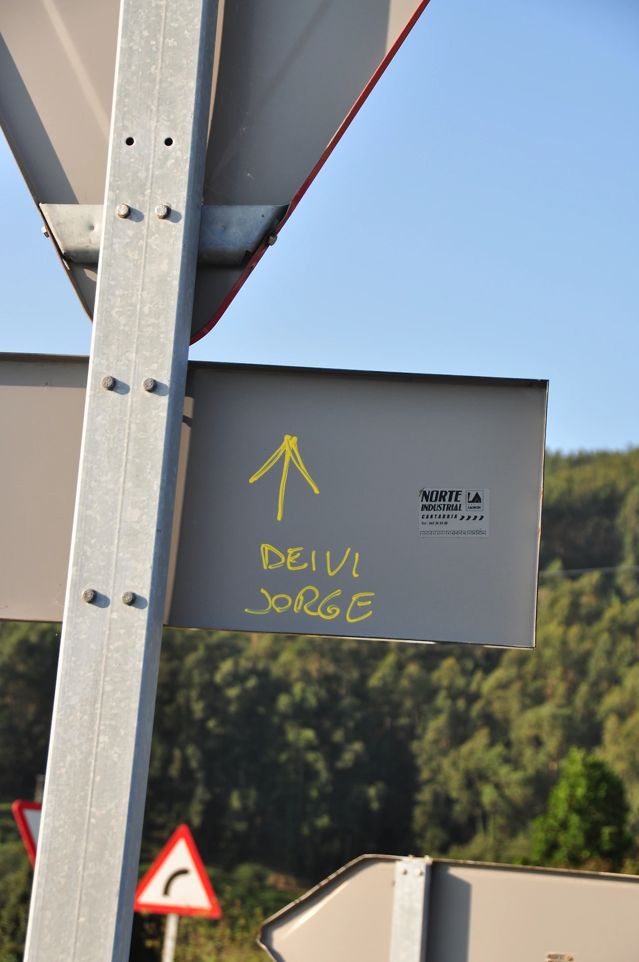 산티아고 순례길의 표시는 곳곳에 보인다. 차량 안내표시판 주변에도 있고 바닥에도 노란색 화살표가 어김없이 그려져 있다. 순례자협회에서 표시한것 같기도 하지만 어느 화살표는 순례자 또는 마을 주변에서 노란색으로 화살표를 그려 놓은 듯 하다. 그렇다고 장난으로 표시한것이 아니라서 믿고 따라갈 수 있었다.