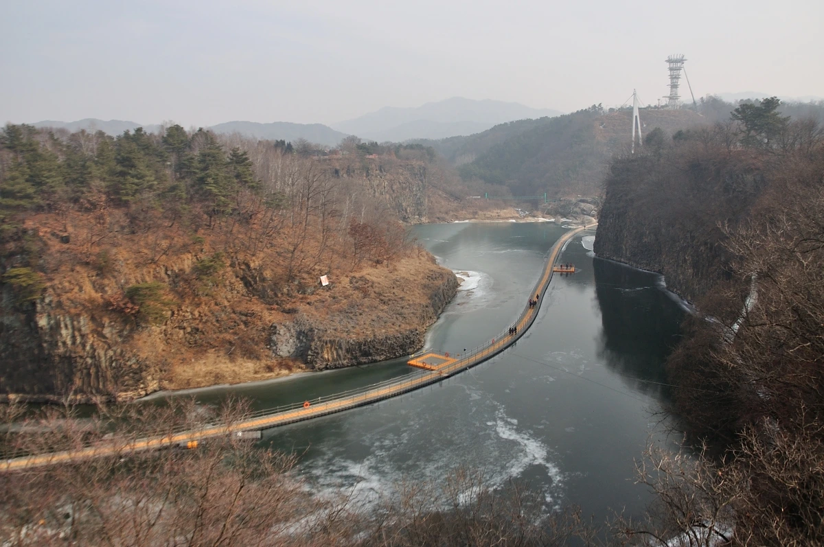 철원 한탄강 주변에 출렁다리(또는 하늘다리)가 먼저 생긴곳은 비둘기낭폭포 옆에 있는 출렁다리이다. 한탄강의 내부까지는 아니더라도 전체 모습을 둘러볼 수 있는 곳이다. 그러나 지금은 훨씬 더 가깝게 한탄강의 주상절리를 감상할 수 있는 곳이 생겼다. 예전 겨울철에 한탄강의 빙판을 걸을 수 있었는데 지금은 물윗길이라는 부교가 설치된 산책길을 통해 한탄강을 즐길 수 있다. 태봉대교부터 시작하여 순담계곡까지 이어진 뜬다리 길이다. 약 8.5km 정도의 거리이지만 걷고 싶은 만큼만 걸으면 된다. 시작하기 가장 좋은 지점은 송대소가 있는 곳에 새롭게 은하수교라는 하늘다리가 생겼는데 여기서부터 시작하면 좋다. 위로는 직탕폭포까지 아래쪽으로 가면 순담계곡까지 사부작 걸을 수 있다. 게다가 높이 솟은 주상절리 절벽을 보면서 걷노라면 시간 가는 줄 모른다. 그저 비경에 발길이 떨어지지 않고 연신 사진을 찍으려고 한다.